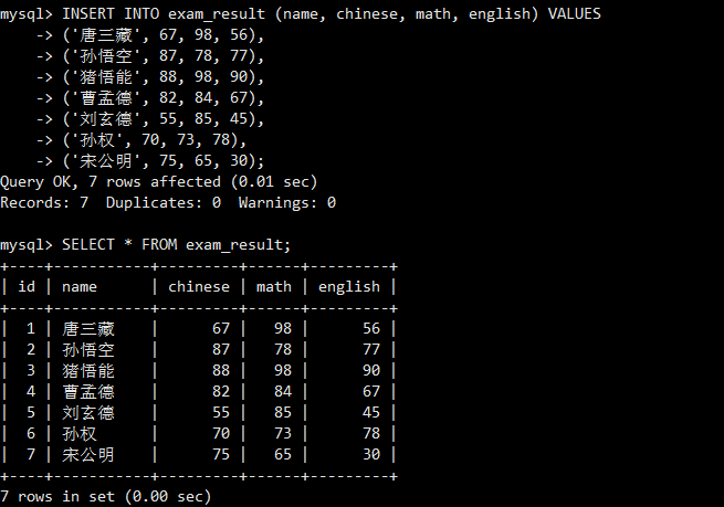 为了演示查询,创建一个成绩表exam_result并插入数据。