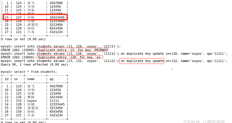 尝试插入id=100的记录,因为主键冲突,触发了ON DUPLICATE KEY UPDATE,将id=100这一行的name更新为'曹阿瞒'。查询结果验证了更新操作。