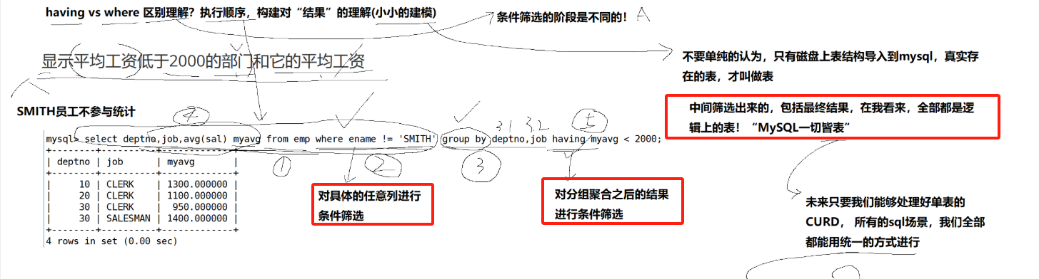 第二步,使用HAVING avg(sal) < 2000对分组后的结果进行过滤,只保留满足条件的部门。