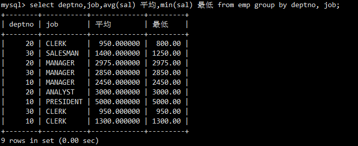 GROUP BY deptno, job进行了多列分组。数据先按部门分,部门内再按岗位分。聚合函数作用于这些更细的子分组。