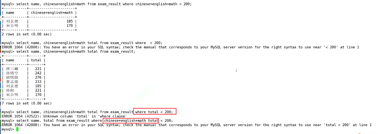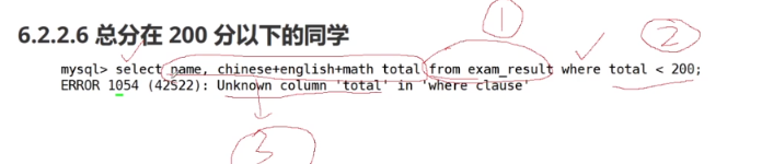 这里尝试在WHERE子句中使用别名total,导致了Unknown column 'total' in 'where clause'的错误。这是因为SQL的执行顺序是先FROM,再WHERE,然后才是SELECT。在执行WHERE时,SELECT子句中定义的别名还不存在。