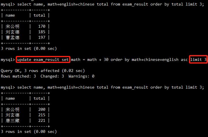 一个更复杂的UPDATE,结合了ORDER BY和LIMIT来定位要更新的记录。先查询出总分倒数前三的同学,然后将他们的数学成绩加上30。注意,UPDATE语句本身不支持+=语法,需要写成math = math + 30。