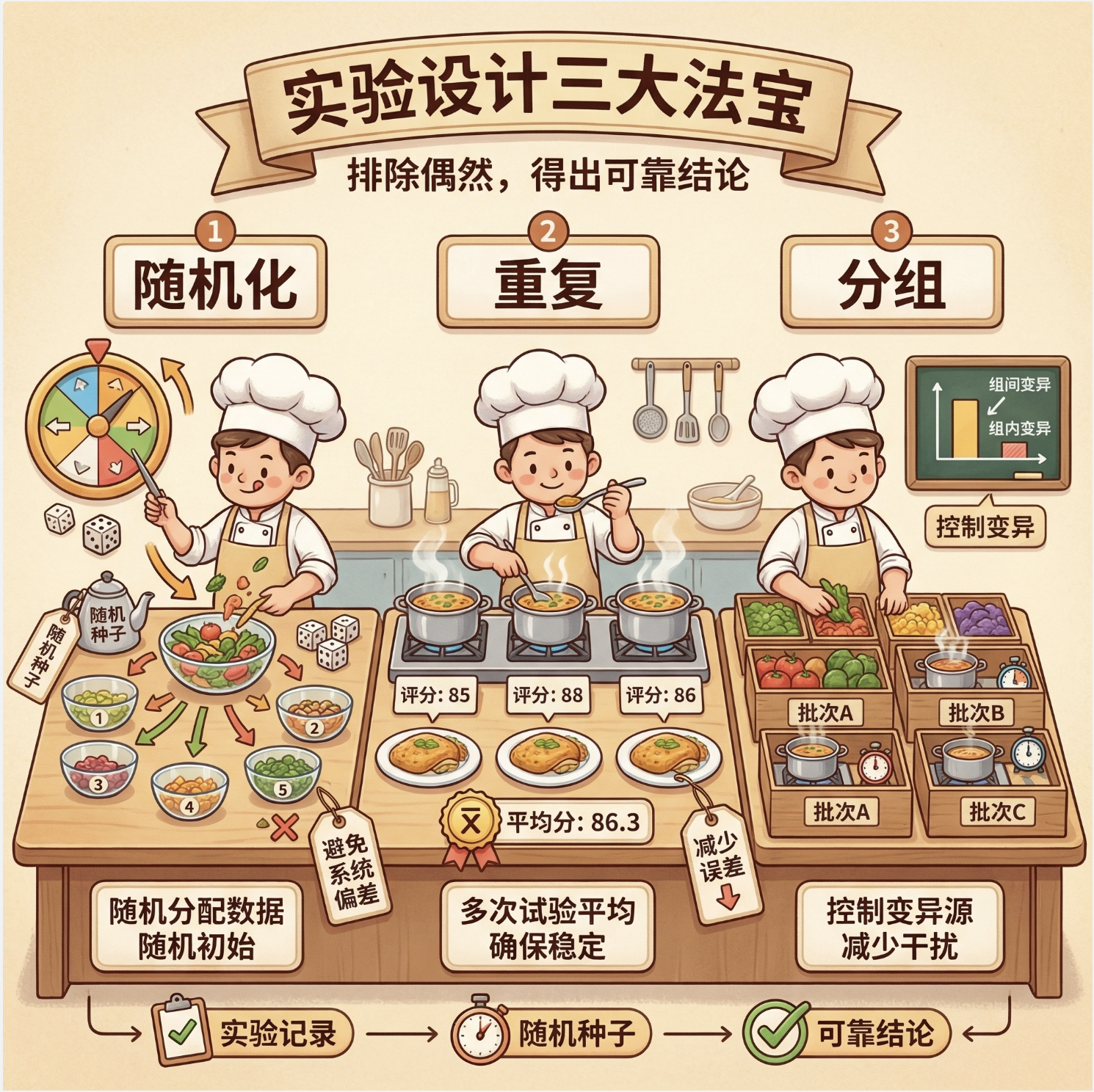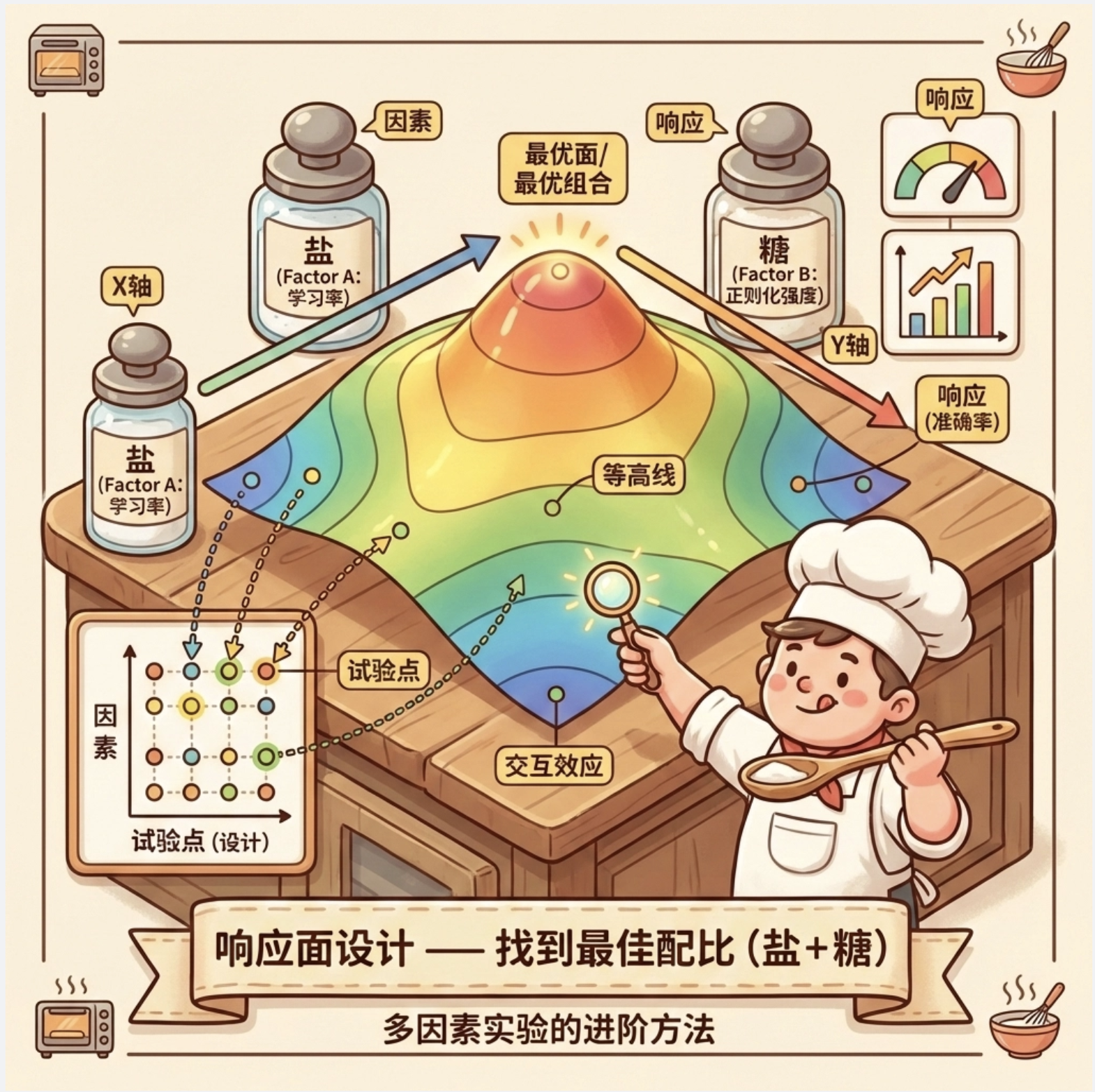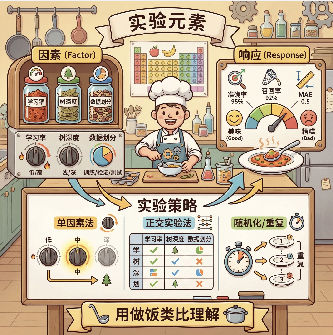 响应(Response) :实验要衡量的结果(比如准确率、召回率、MAE),就像菜的咸淡、口感。