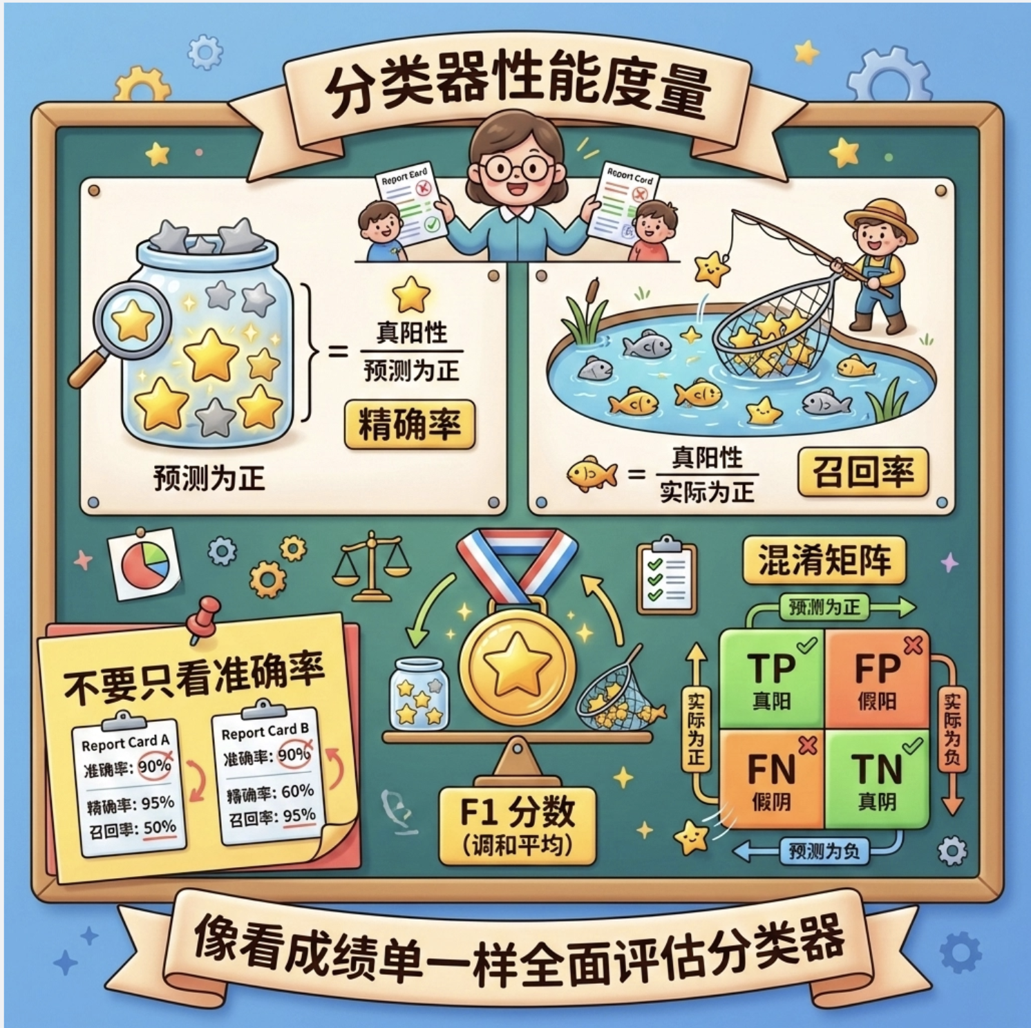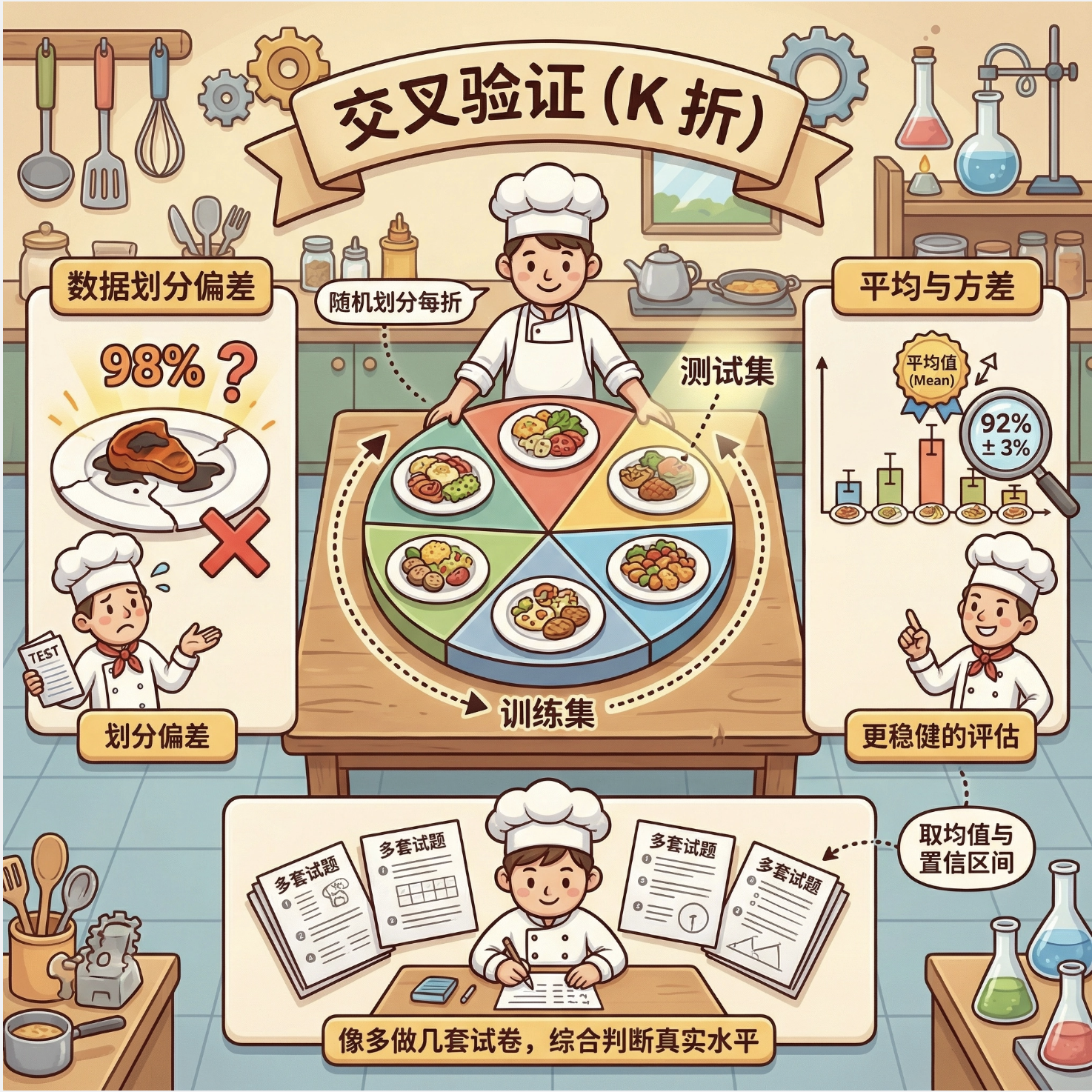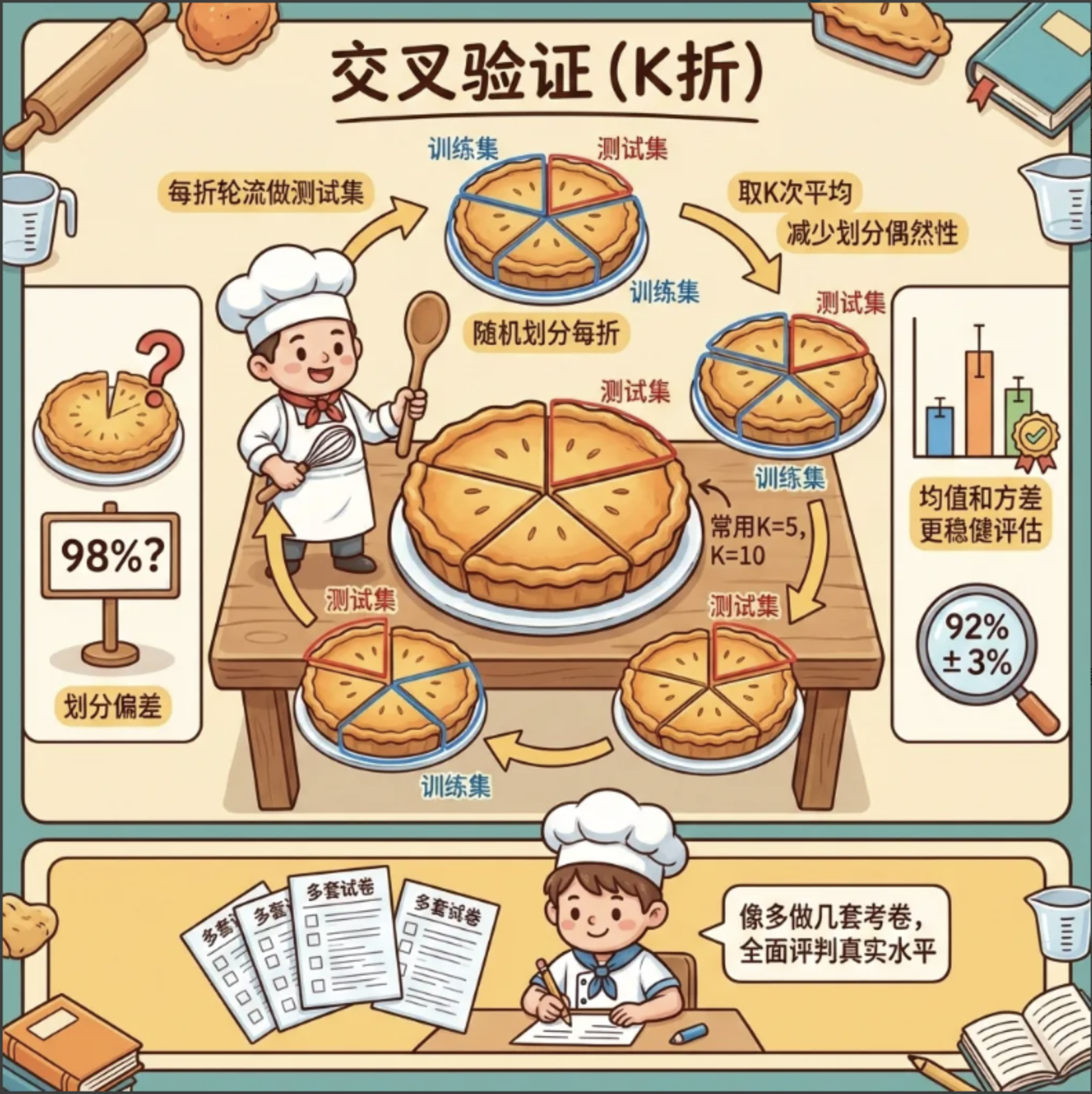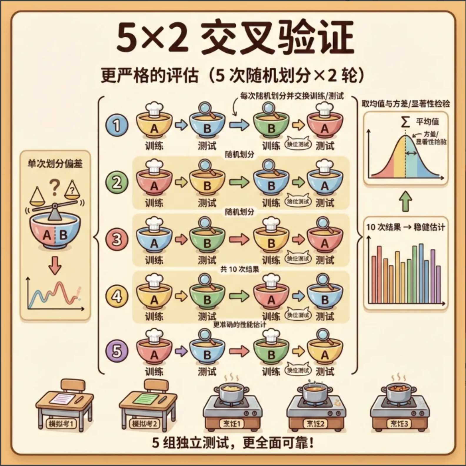 2.评估方法 :交叉验证(K 折、5×2)比单次划分更可靠,多指标评估(准确率 + 精确率 + 召回率)比单一指标更全面