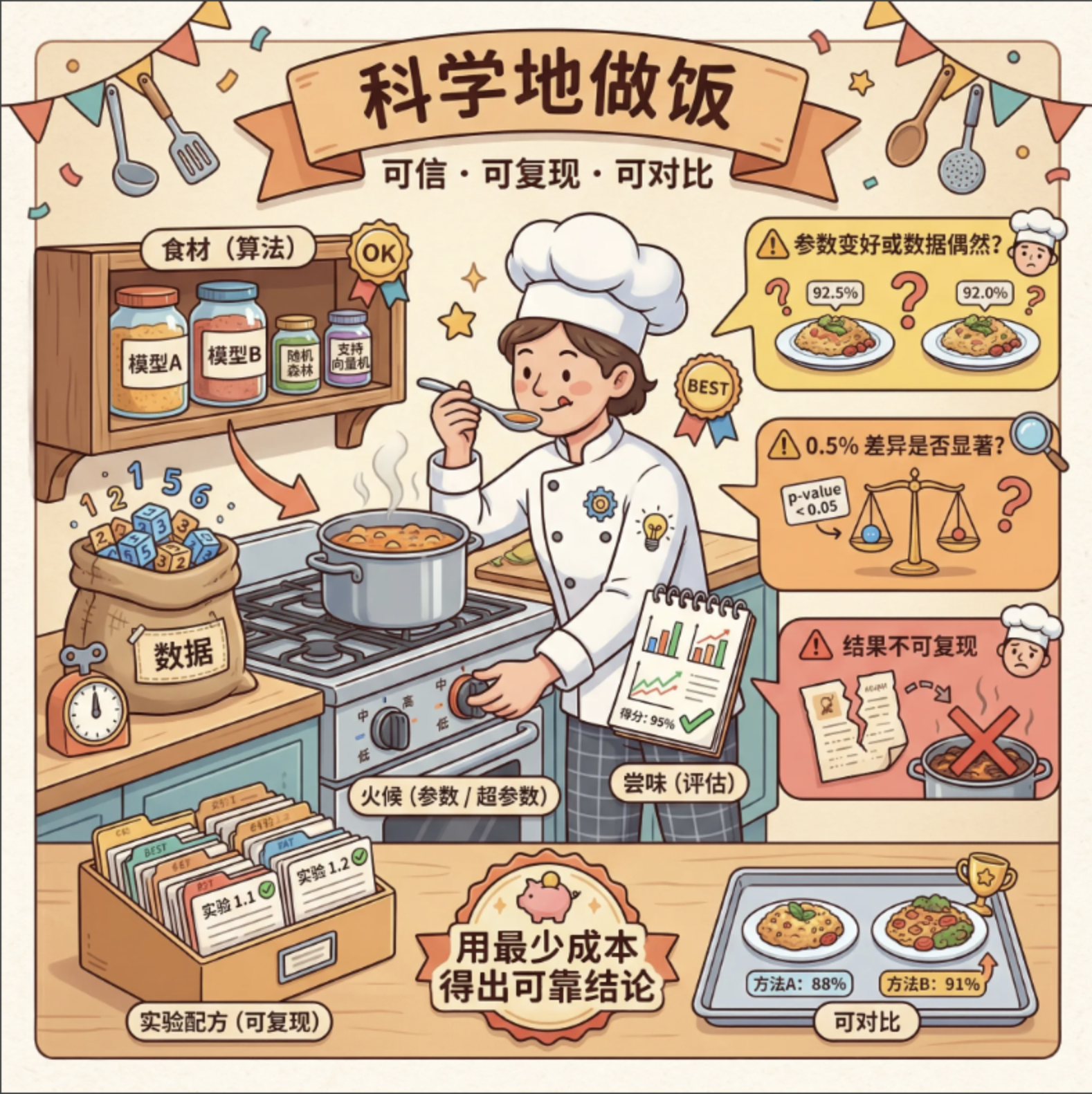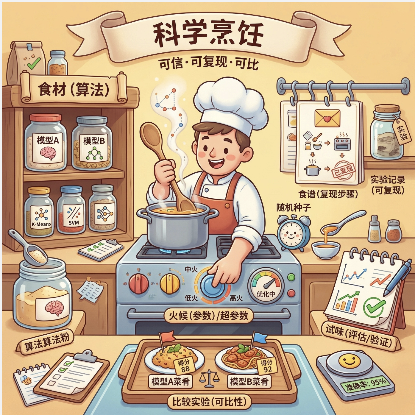 做机器学习实验就像做饭 ------ 选对食材(算法)、控制火候(参数)、尝味调整(评估),少一步都做不出好菜。第 19 章的核心就是教我们如何「科学地做饭」,让实验结果可信、可复现、可对比。