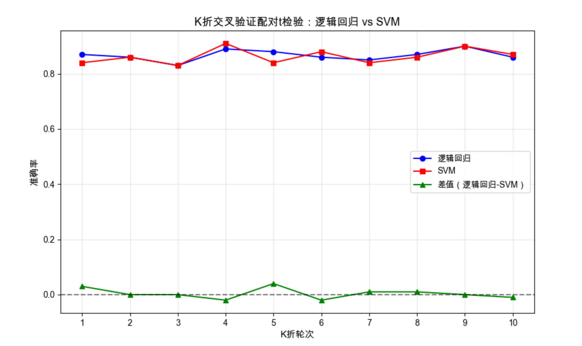 plt.title('K折交叉验证配对t检验:逻辑回归 vs SVM', fontsize=13)