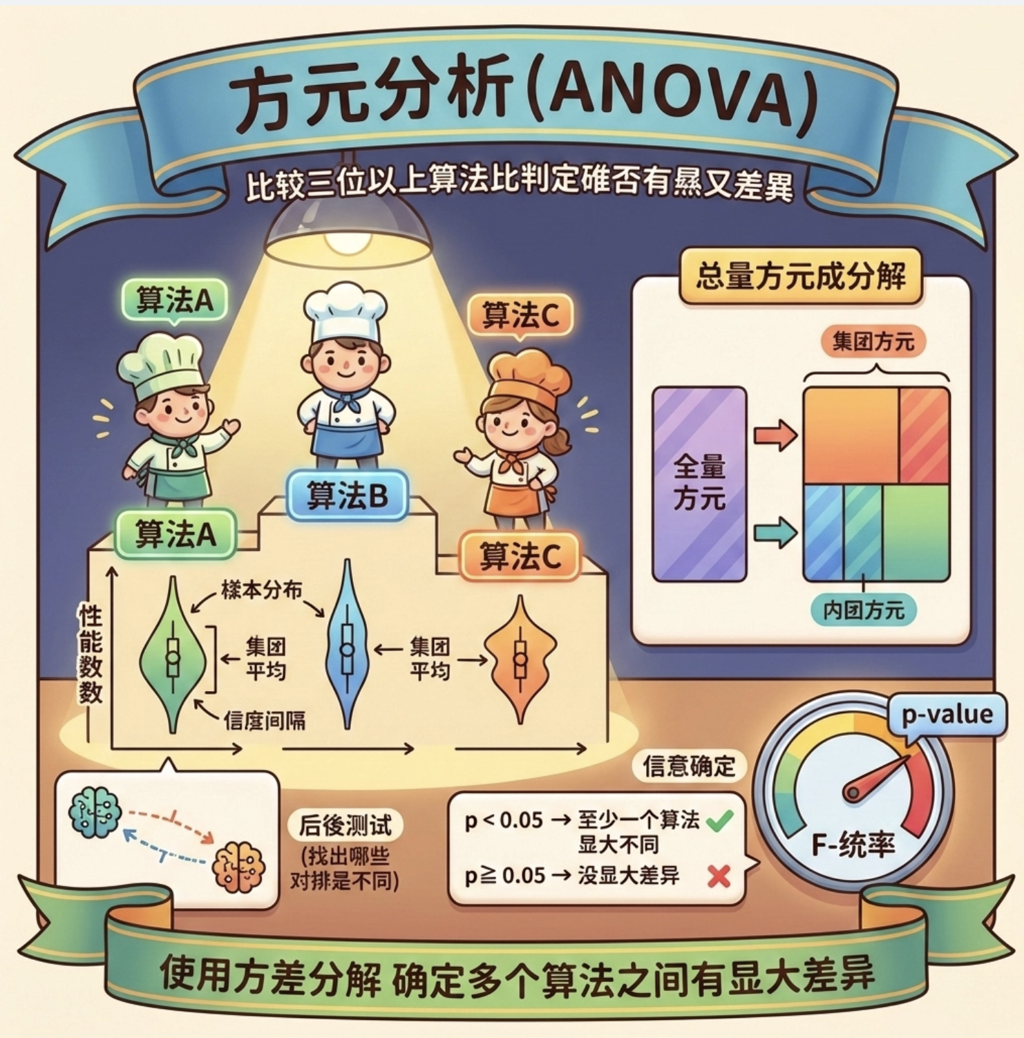 方差分析(ANOVA)用于比较三个及以上算法的性能,判断是否至少有一个算法的性能显著不同。