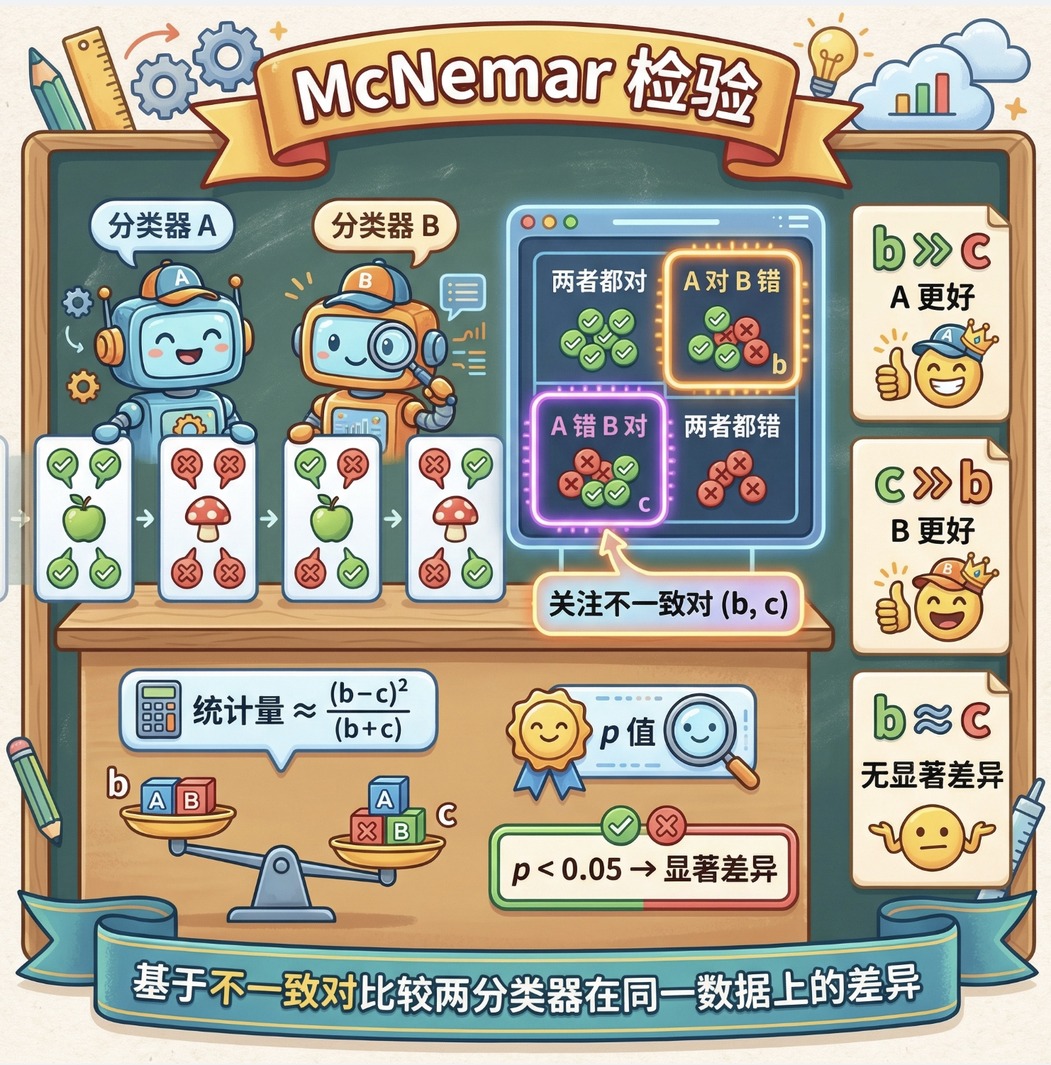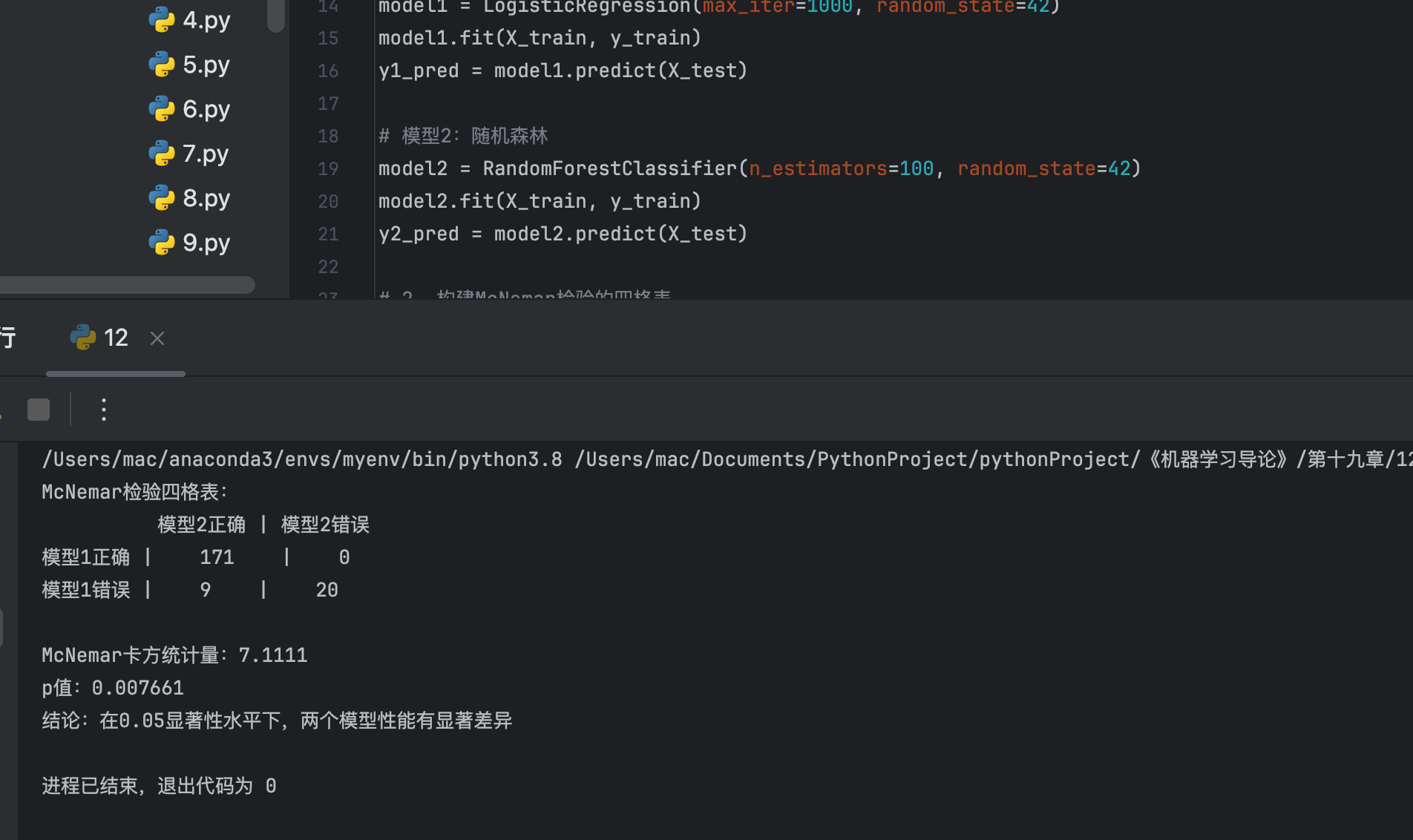 (多元检验考虑多个评价指标,如同时比较准确率、召回率、F1 分数,代码可参考上述单指标检验扩展)