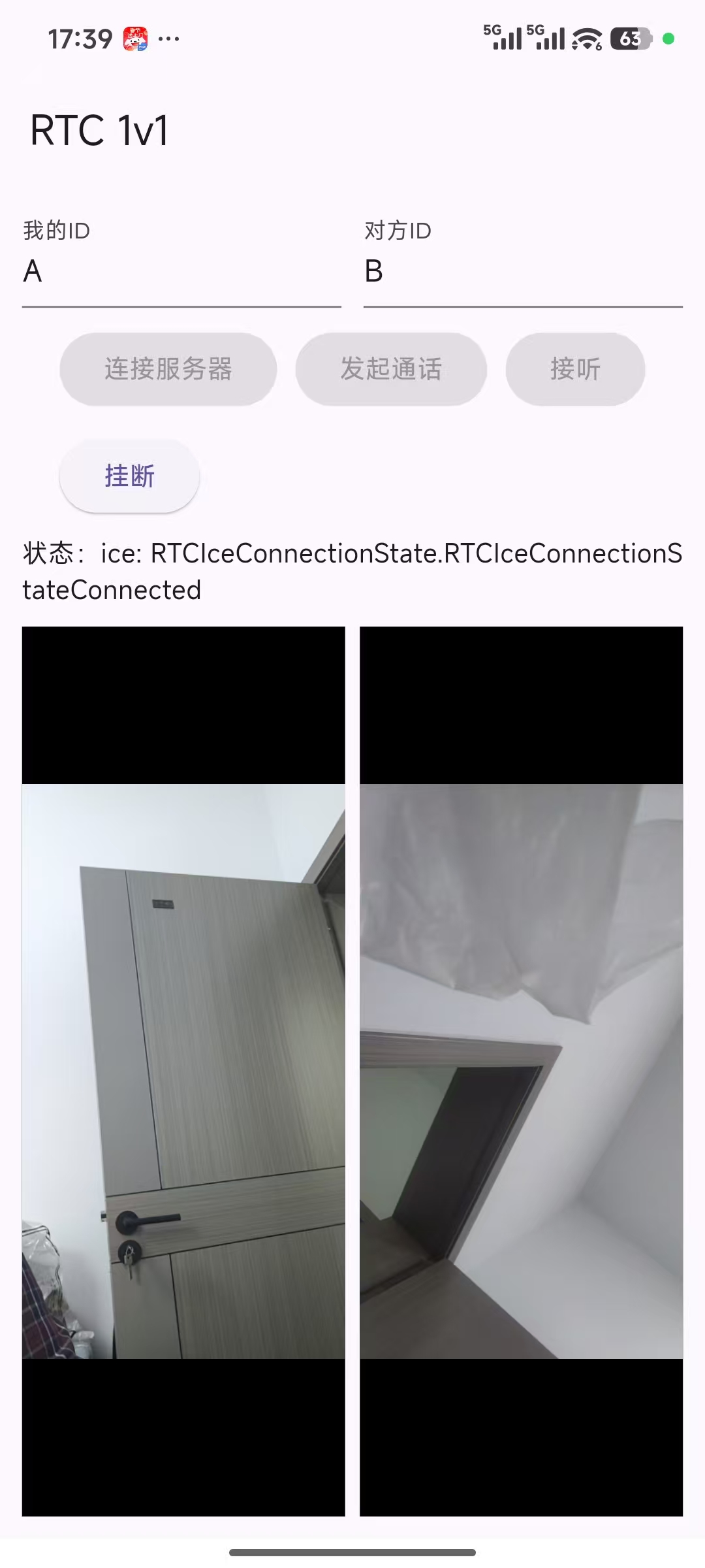 先把 Flutter 端 1V1 音视频跑通,信令服务器使用(register/offer/answer/candidate/hangup 的 WebSocket 转发协议)