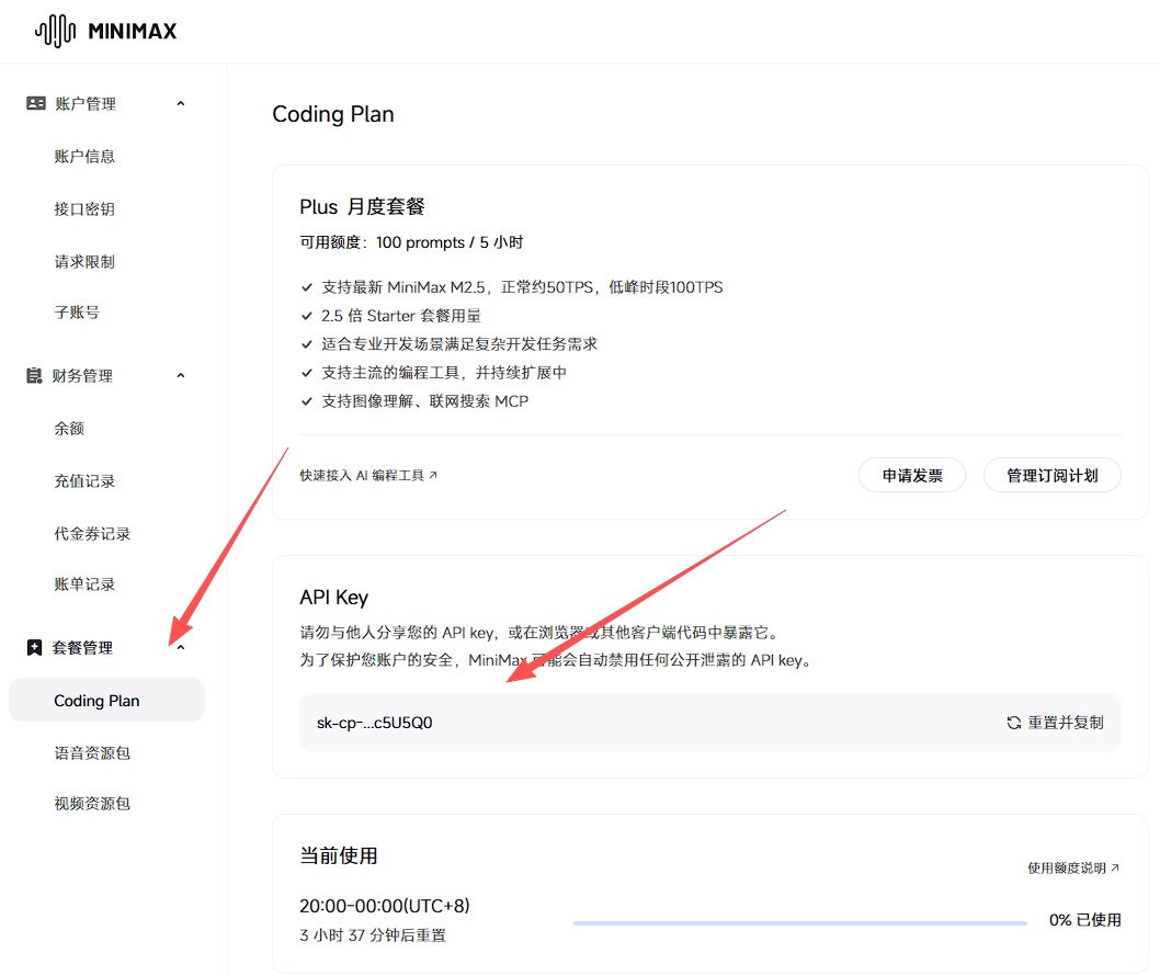 获取 API Key https://platform.minimaxi.com/user-center/payment/coding-plan