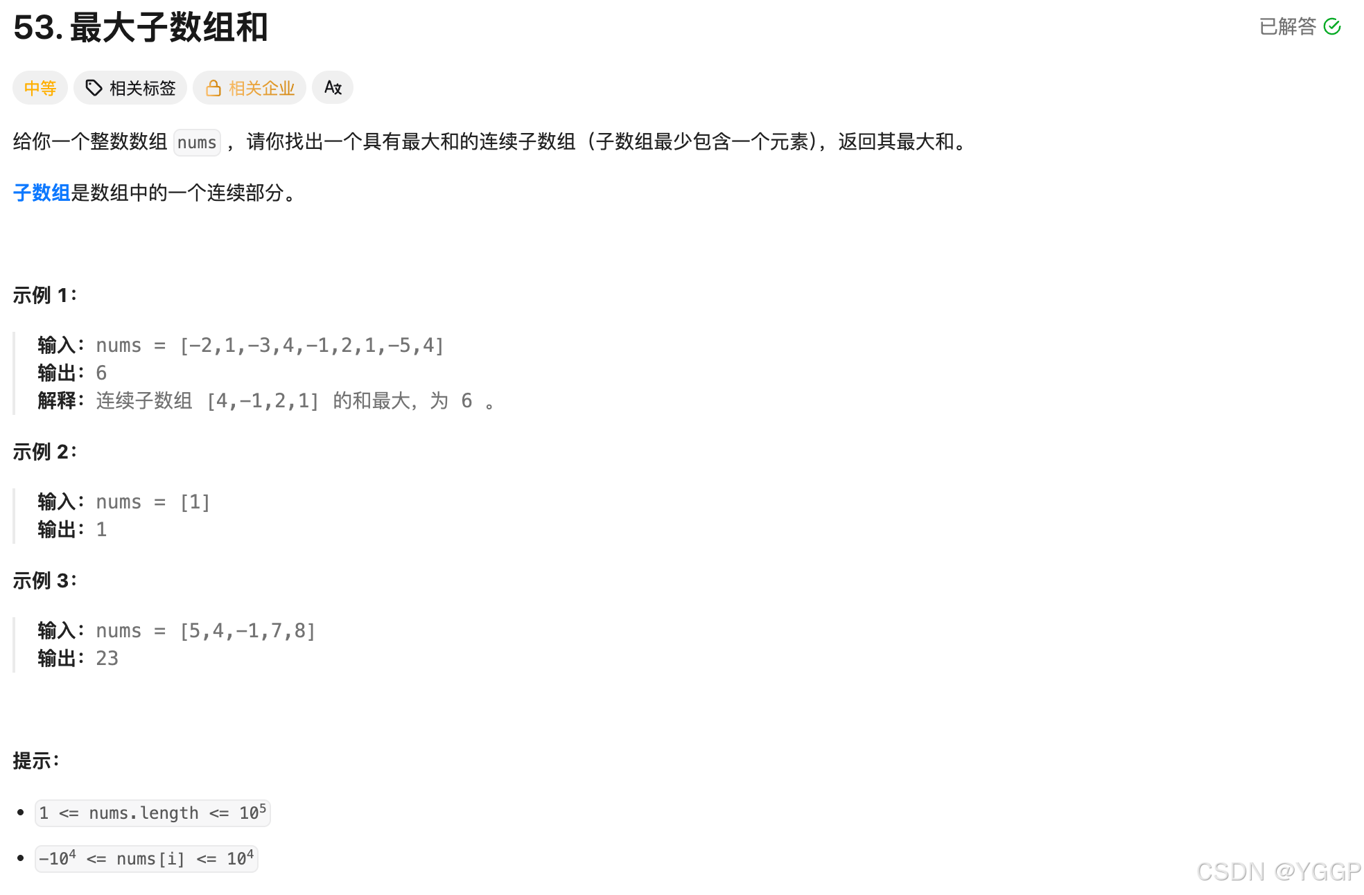 由于数组当中可能会出现负数,我们使用curr来对数组和的中间状态进行记录,当curr + nums[i] < nums[i]时,说明当前的子数组和已经比当前数值更小了,此时我们重新开始统计子数组和,令curr = nums[i]。