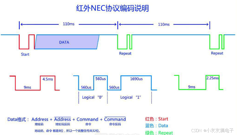 逻辑0时长 = 560 μ s + 560 μ s = 1.12 m s 逻辑1时长 = 560 μ s + 1680 μ s = 2.24 m s \text{逻辑0时长} = 560\mu s + 560\mu s = 1.12ms \\ \text{逻辑1时长} = 560\mu s + 1680\mu s = 2.24ms 逻辑0时长=560μs+560μs=1.12ms逻辑1时长=560μs+1680μs=2.24ms