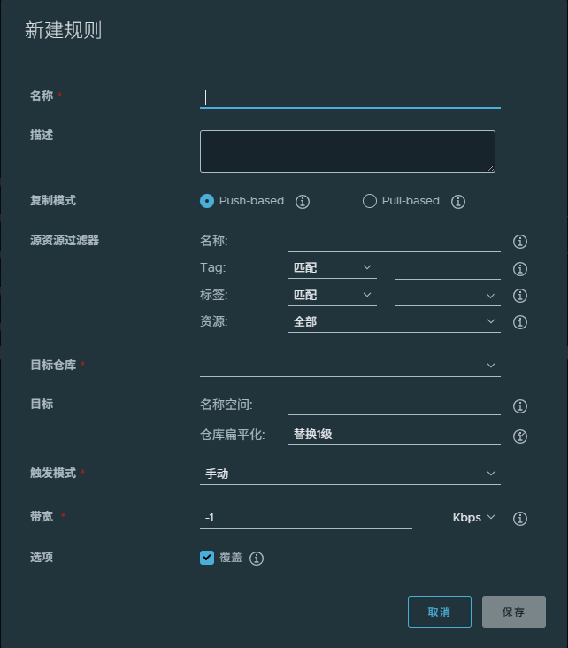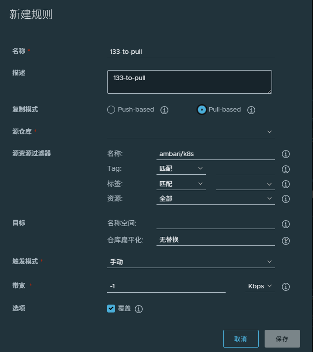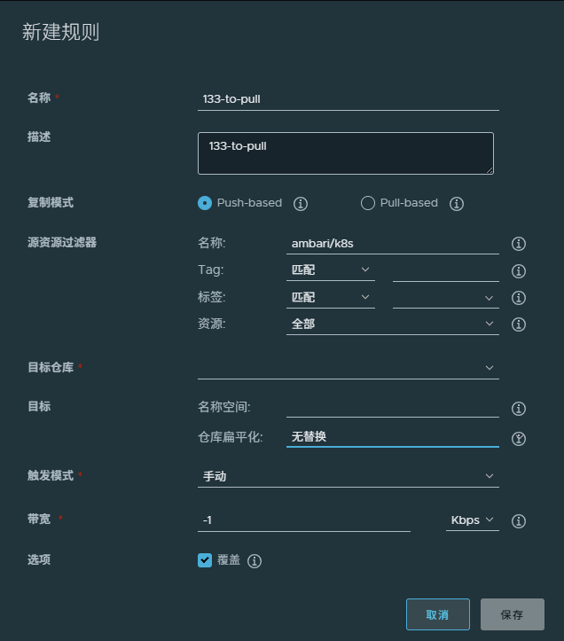 -1表示不限制带宽,充分利用网络资源。 - 覆盖:勾选后,如果远程目标中已存在同名同标签的镜像,将强制覆盖;未勾选则会跳过已存在的镜像,避免覆盖重要数据。