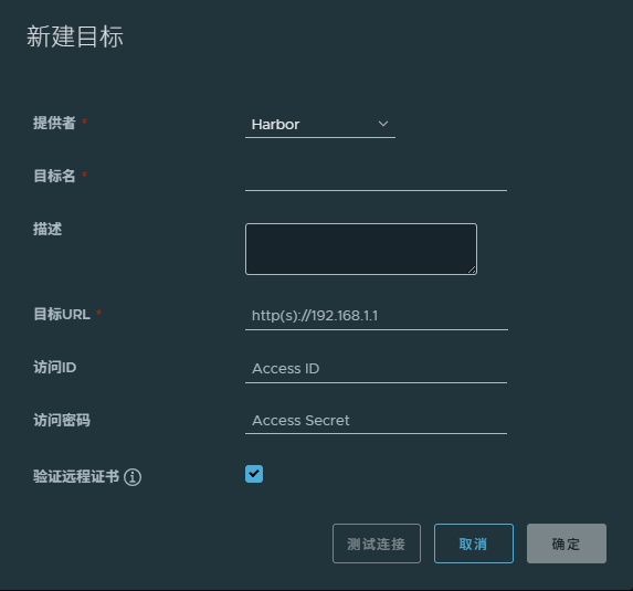 - 取消勾选:跳过证书验证,适用于目标 Harbor 使用自签名证书的场景(避免因证书不被信任导致连接失败)。