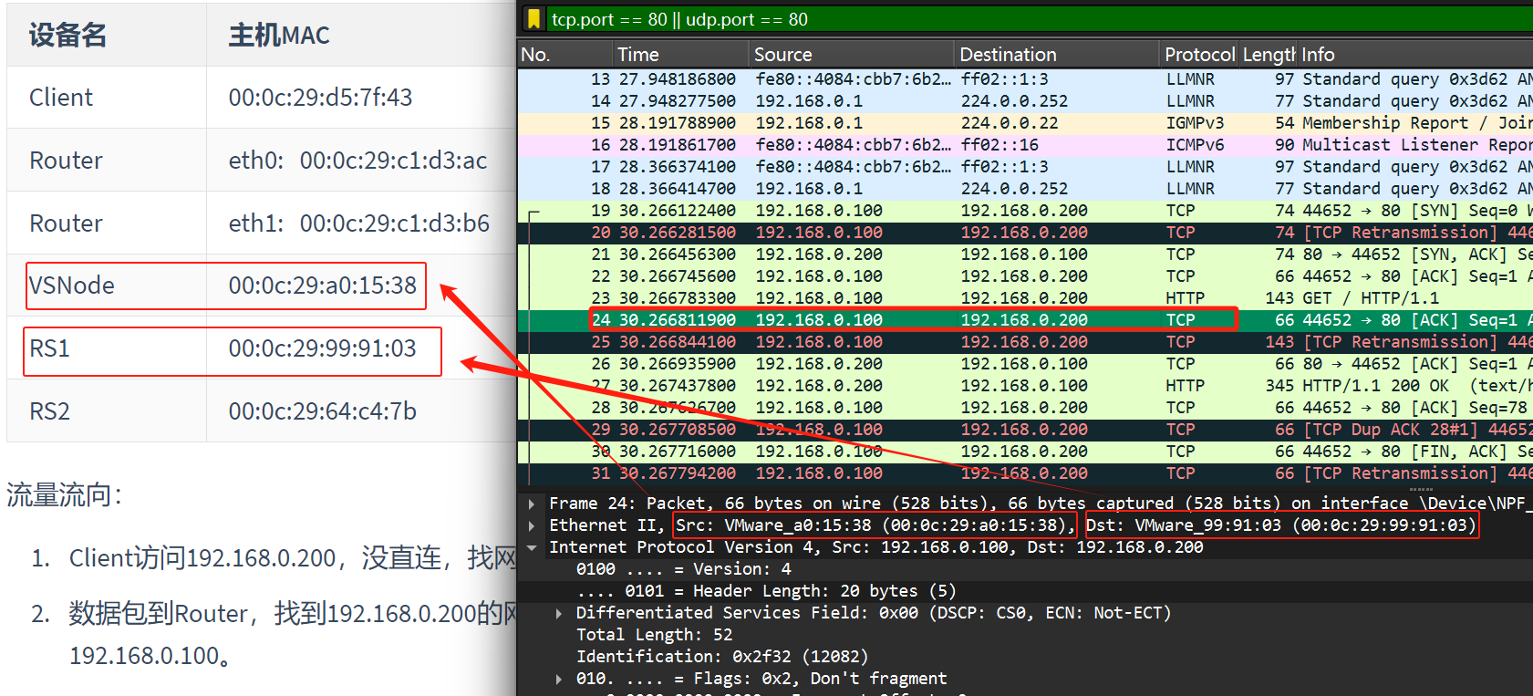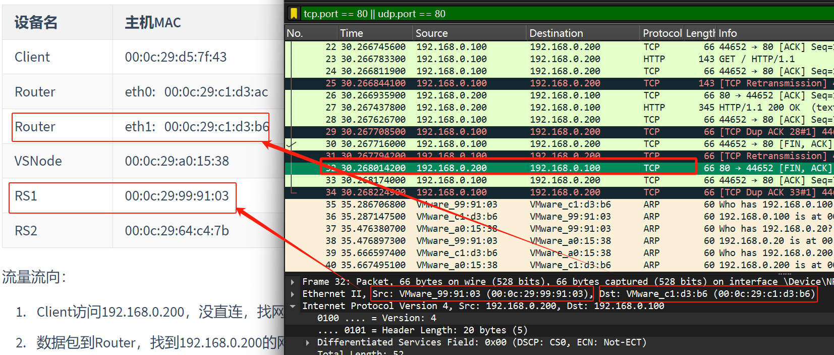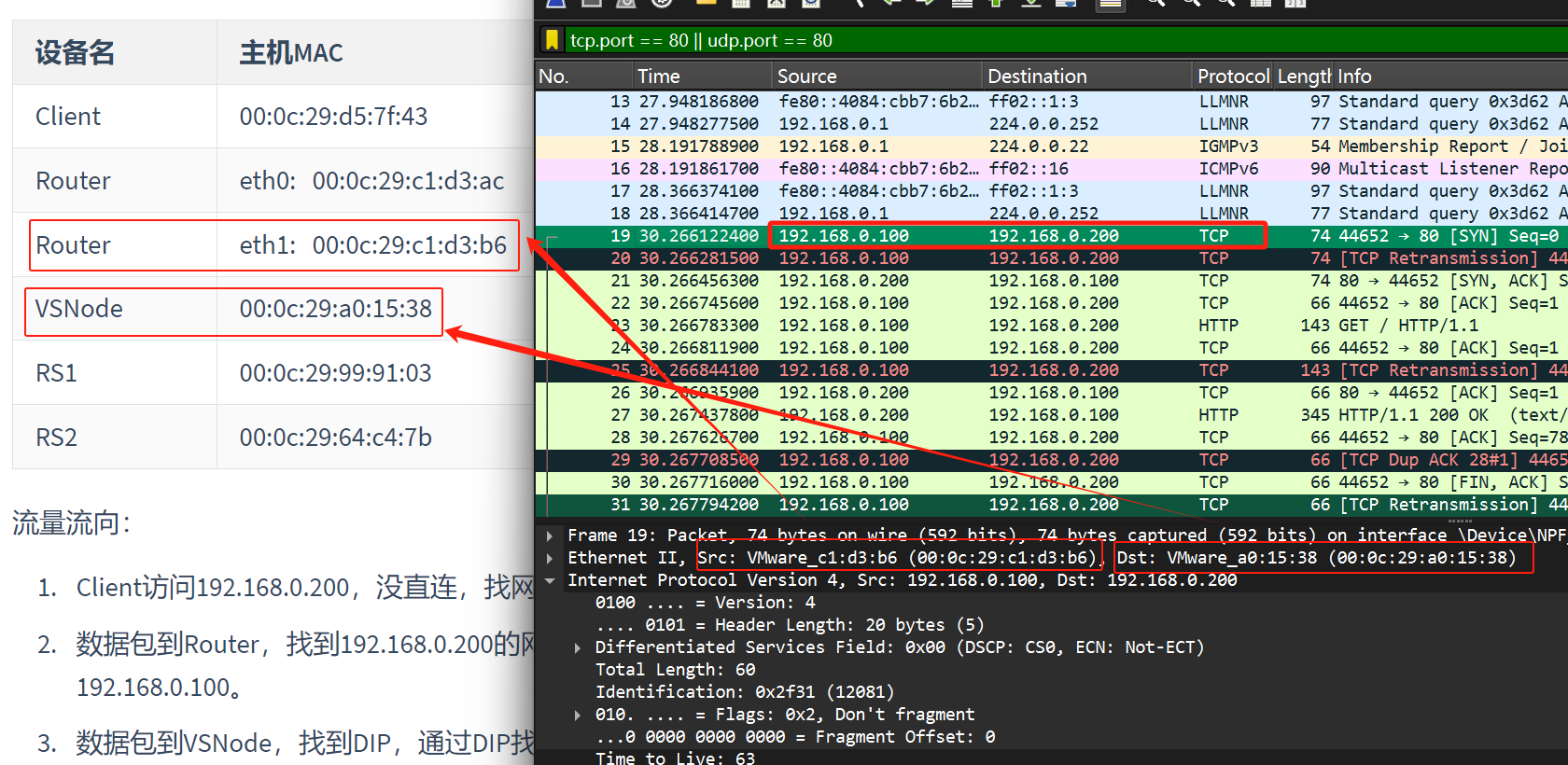 数据包到Router,找到192.168.0.200的网关192.168.0.100,进行LVS中的DR模式,所以在wireshark中看到的是192.168.0.100。