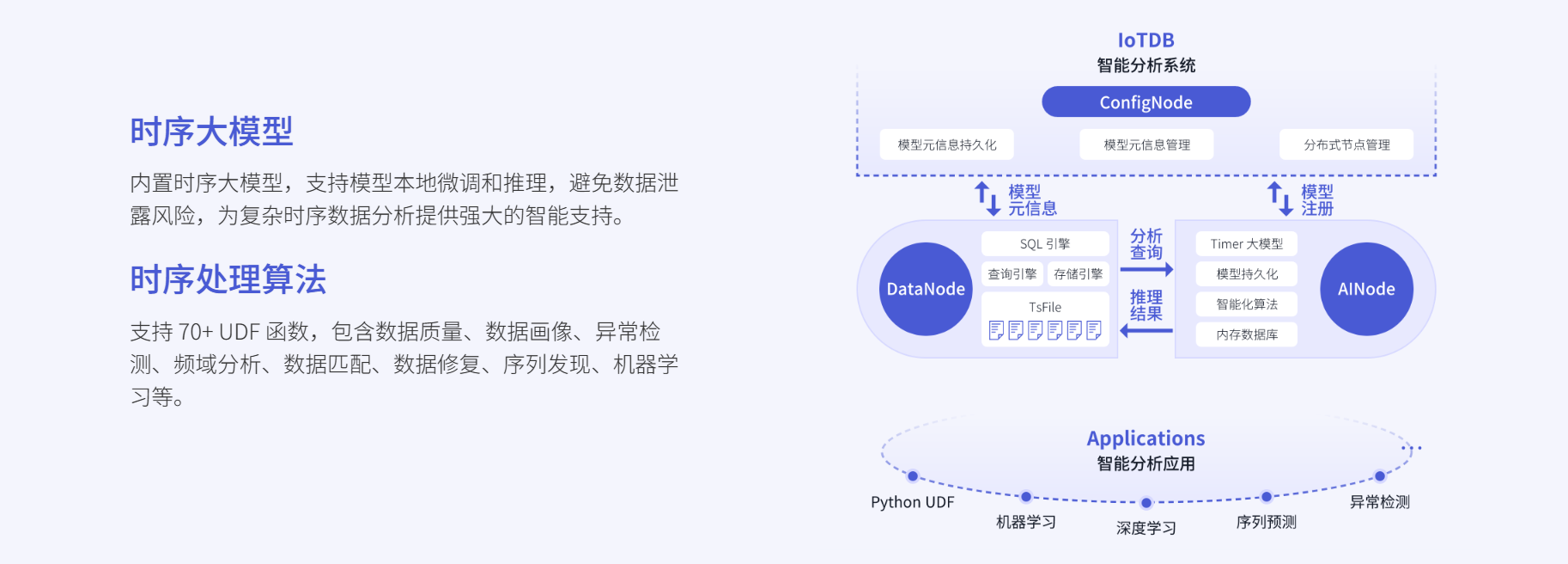 IoTDB不仅具备高效的时序数据存储能力,还集成了多样化的智能分析功能,拓展数据应用边界: