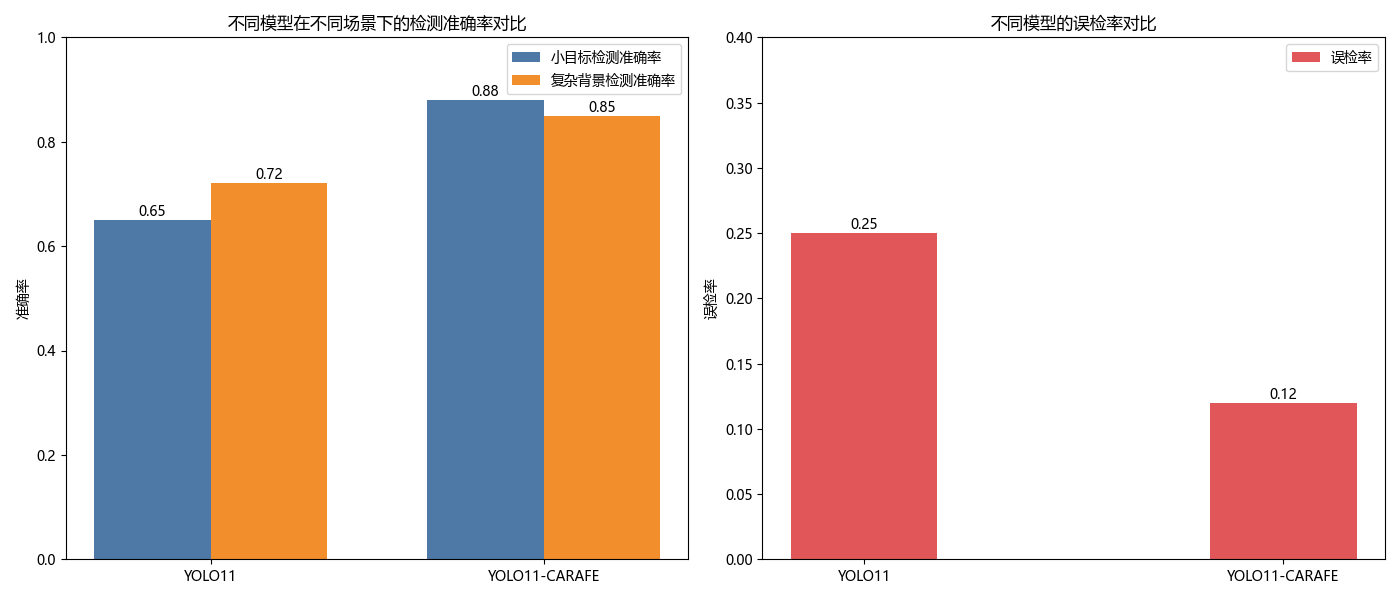 在模型复杂度方面,引入CARAFE上采样机制后,参数量从28.5M增加到29.1M,计算量从7.8G增加到8.2G,增幅相对较小,表明CARAFE上采样机制在提升性能的同时,对模型复杂度的增加有限。