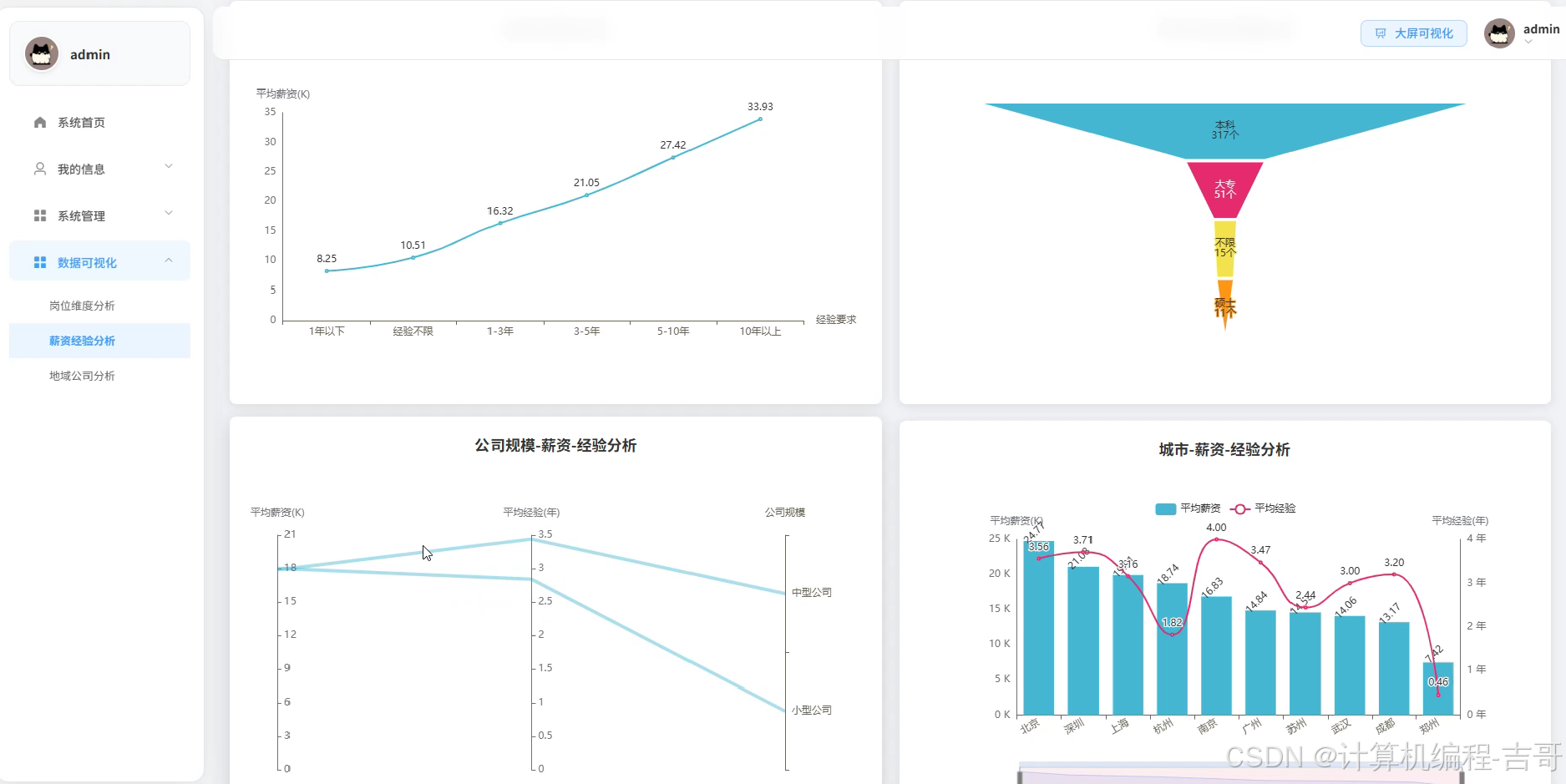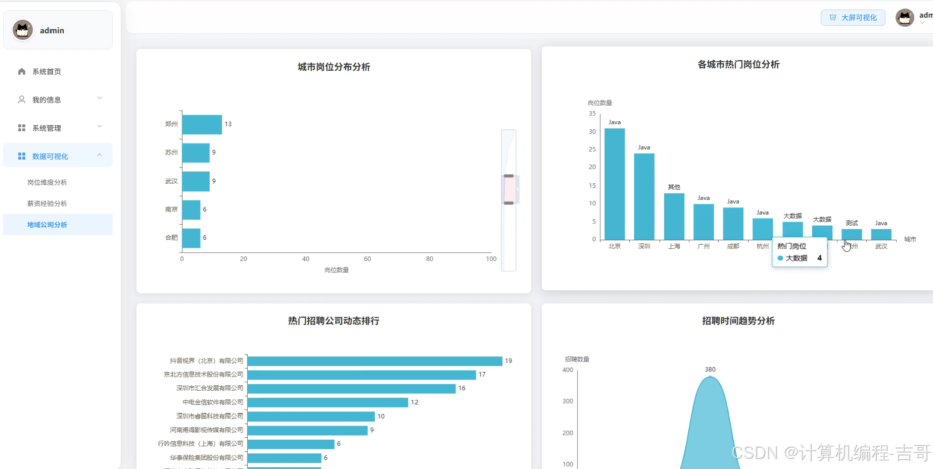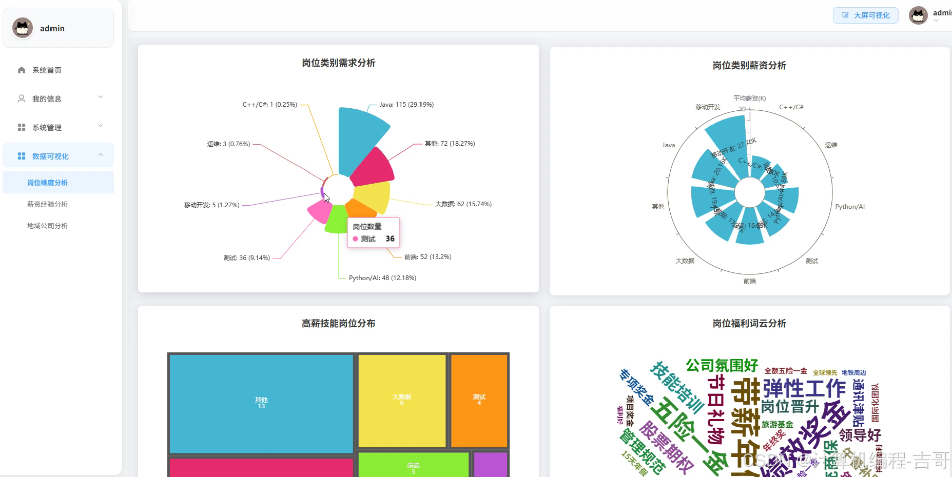 - 丰富可视化:多模块菜单分析 + 多图表展示 + 可视化大屏综合展示
