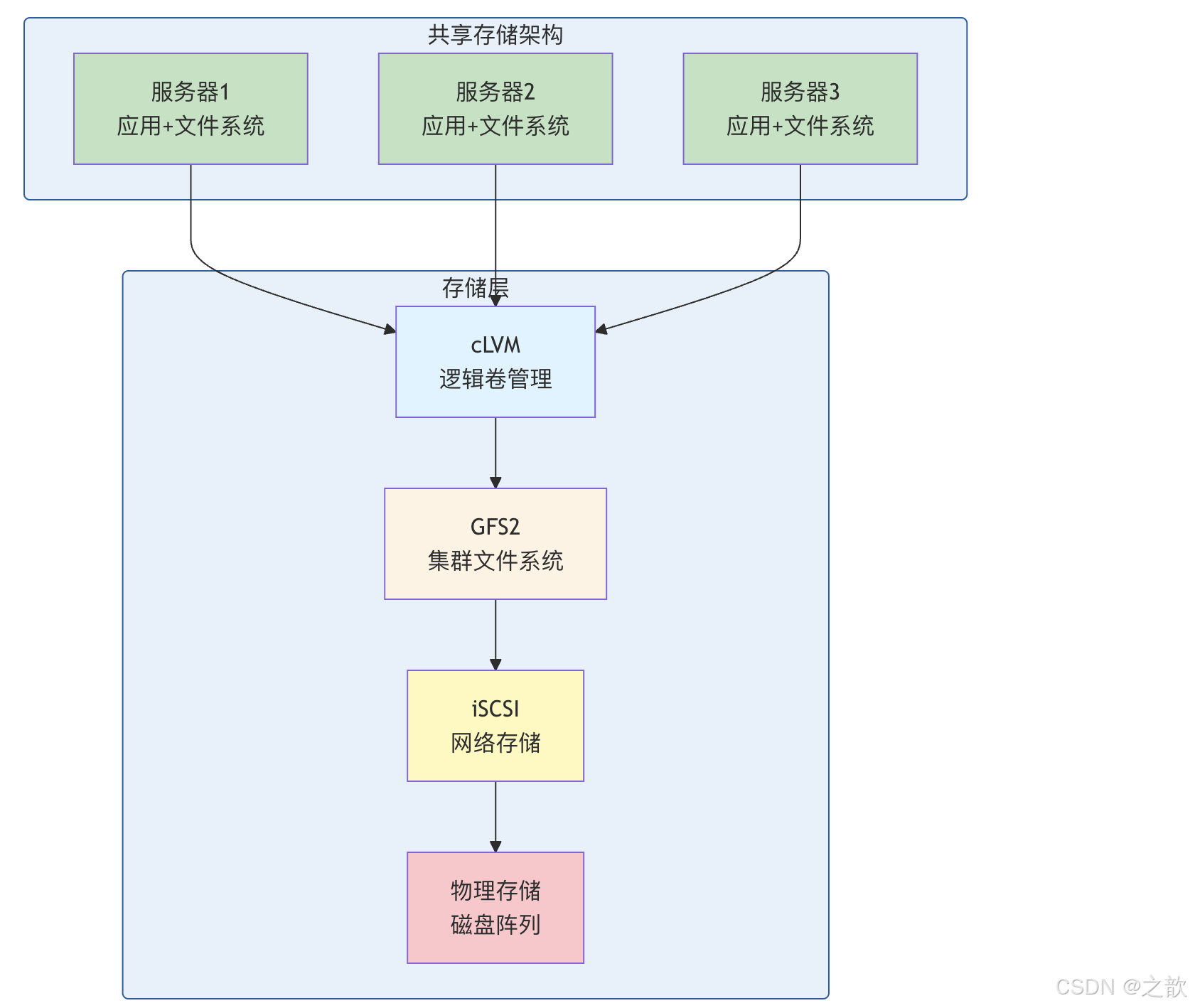 三层缺一不可:iSCSI 提供共享块,cLVM 管理共享卷,GFS2 提供多机一致的文件视图。