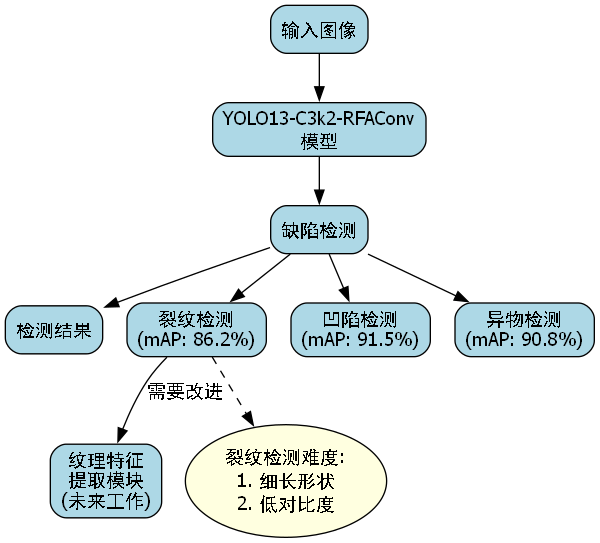 从图中可以看出,YOLO13-C3k2-RFAConv模型对各种类型的缺陷都有较好的检测效果,其中对凹陷和异物的检测效果最好,mAP分别达到91.5%和90.8%,而对裂纹的检测效果相对较差,mAP为86.2%。🔍 分析原因可能是因为裂纹通常具有细长的形状,且与背景对比度较低,增加了检测难度。针对这一问题,我们在后续工作中考虑引入更多的纹理特征提取模块,进一步提升对裂纹类缺陷的检测能力。