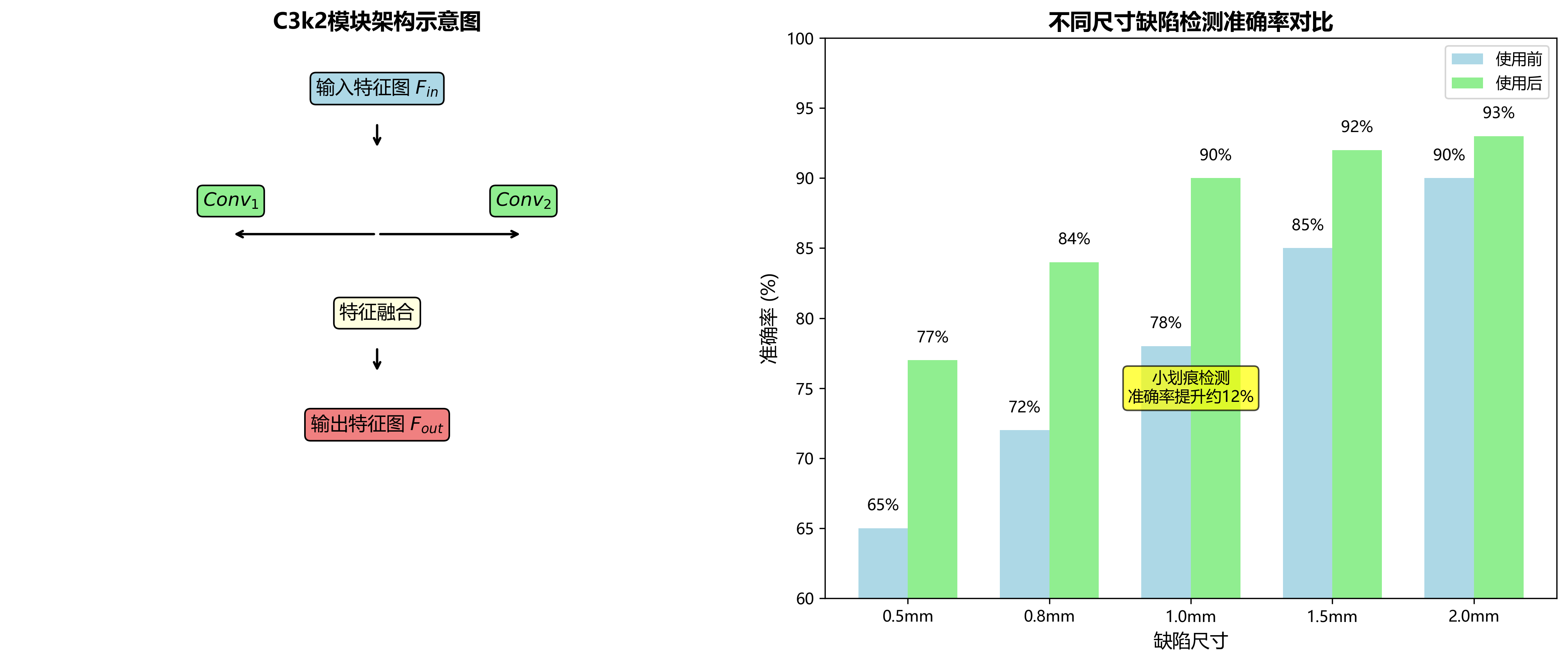这个公式体现了模型的核心创新点------通过半径感知卷积和改进的特征融合模块,模型能够更有效地提取和融合多尺度特征,从而提高对法兰盘表面缺陷的检测能力。在实际应用中,这种结构设计使得模型能够同时关注大范围的裂纹和小型的凹坑等不同类型的缺陷,显著提升了检测精度。