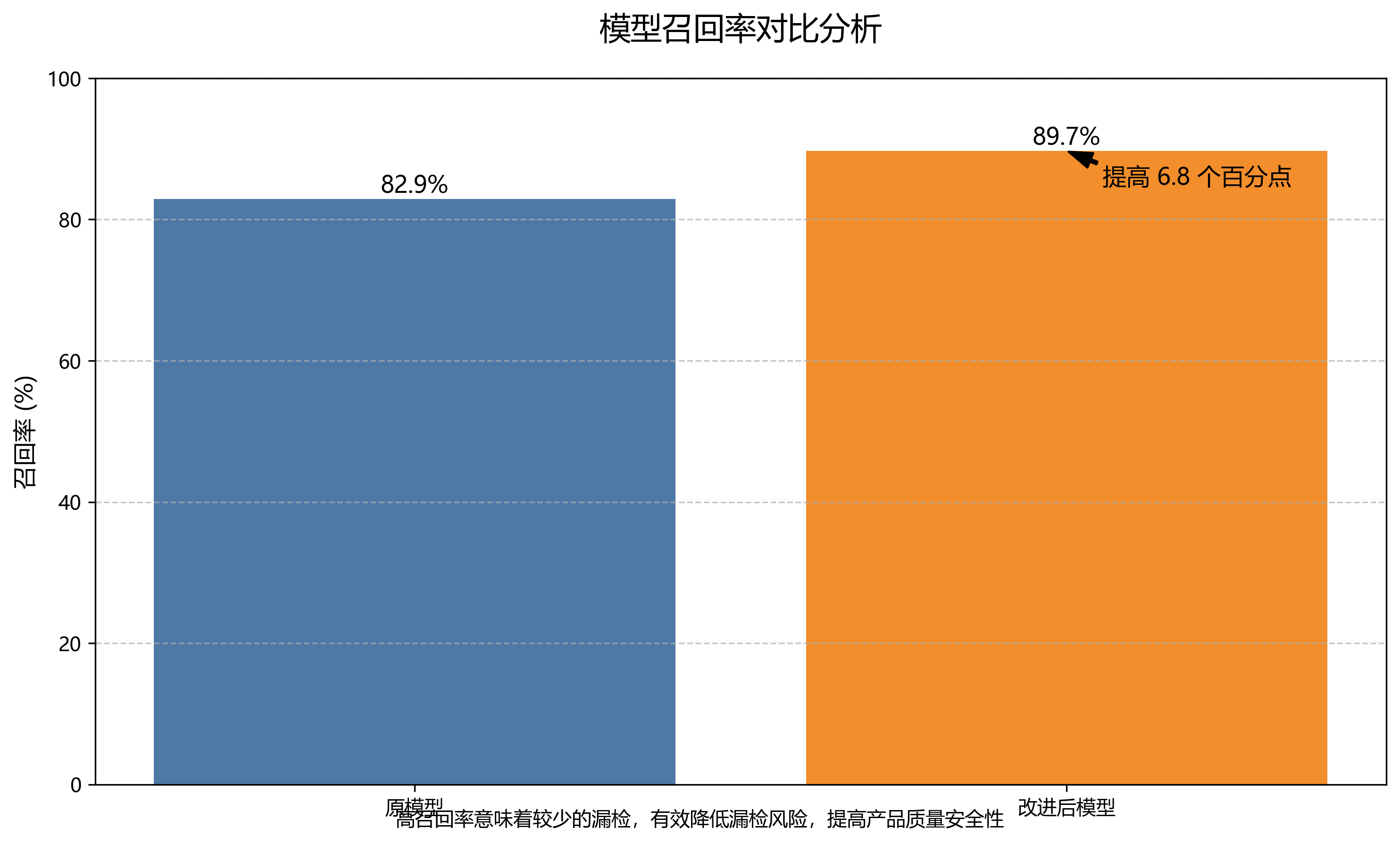 召回率反映了模型找出所有正例的能力,高召回率意味着较少的漏检。在工业质检场景中,漏检可能导致有缺陷的产品流入市场,造成安全隐患,因此召回率至关重要。我们的实验显示,改进后的模型对各类缺陷的平均召回率达到89.7%,比原模型提高了6.8个百分点,有效降低了漏检风险,提高了产品质量安全性!🛡️