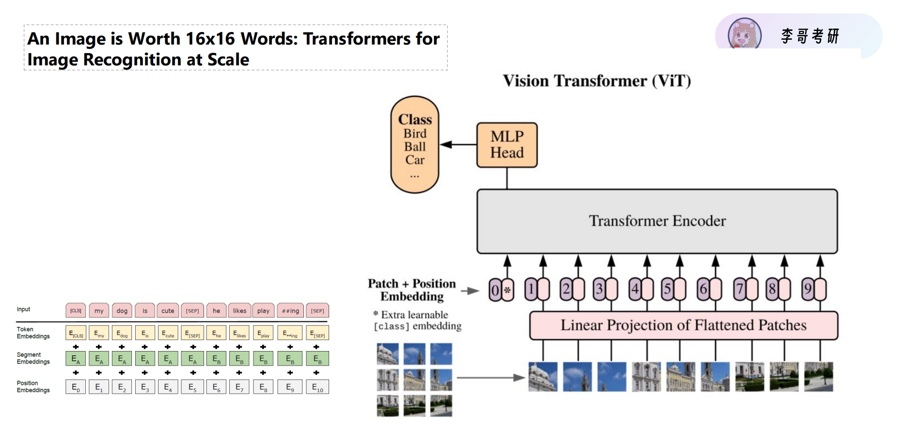 在输入序列的最前面,ViT 增加了一个可学习的 [class] embedding (图中标记为)。