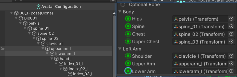 身体部位 Unity 识别的命名关键词(不区分大小写) Hips(臀部/根骨骼) hip,pelvis,rootSpine(脊柱) spine,backChest(胸部) chest,torso,bodyNeck(颈部) neckHead(头部) headLeft Arm(左臂) left arm,arm.l,l_arm,arm_leftRight Arm(右臂) right arm,arm.r,r_arm,arm_rightLeft Hand(左手) left hand,hand.l,l_handRight Hand(右手) right hand,hand.r,r_handLeft Leg(左腿) left leg,leg.l,l_leg,thigh.lRight Leg(右腿) right leg,leg.r,r_leg,thigh.rLeft Foot(左脚) left foot,foot.l,l_foot,ankle.lRight Foot(右脚) right foot,foot.r,r_foot,ankle.r除了命名,Unity 还会分析 骨骼的层级关系: