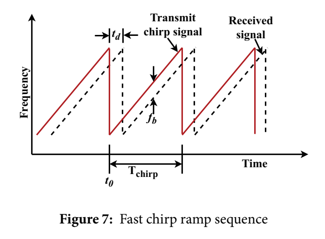 | Fast chirp ramp | ΔR=c2B\Delta R=\frac{c}{2B}ΔR=2Bc, vreso=λ/(2Tf)v_{reso}=\lambda/(2T_f)vreso=λ/(2Tf) | 2D-FFT provides accurate Range & Doppler |