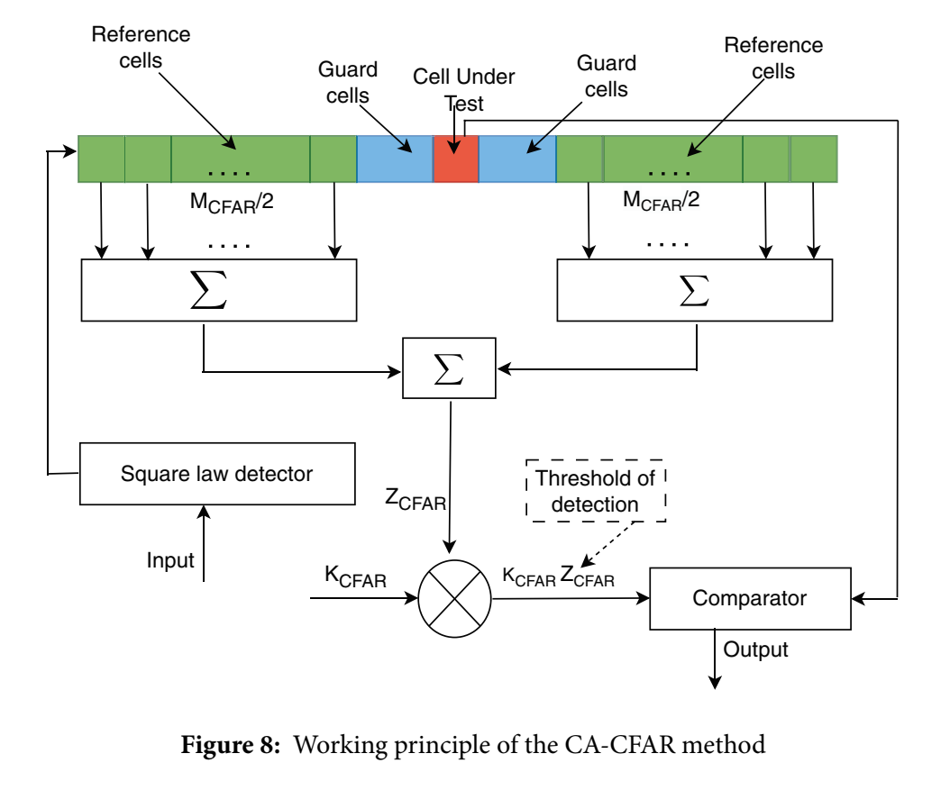 在均匀平面阵列(水平/垂直阵元)下,空间时延对阵元索引近似线性,因此整个数据就成为"多个维度的正弦/复指数乘积"。这正是多维 FFT 能够把目标在各维分离开的原因。 #### 6.2 4D FFT:把距离/速度/方位/俯仰同时拉开 采样得到 x\[l,r,m\]=x\~m,r(lTs)x\[l,r,m\]=\\tilde x_{m,r}(lT_s)x\[l,r,m\]=x\~m,r(lTs),对快时间、慢时间与两维阵元做 FFT/波束扫描,文章写出 4D FFT: X\[p,q,θ,ϕ\]=∑mv=1M∑mh=1M∑r=1R∑l=1Lx\[l,r,m\] e−j2πplL e−j2πqrR⋅ej2πdaλmhsinθcosϕ ej2πdaλmvsinϕ(27) \\begin{aligned} X\[p,q,\\theta,\\phi\] =\& \\sum_{m_v=1}\^{M}\\sum_{m_h=1}\^{M}\\sum_{r=1}\^{R}\\sum_{l=1}\^{L} x\[l,r,m\]\\, e\^{-j2\\pi p\\frac{l}{L}}\\, e\^{-j2\\pi q\\frac{r}{R}} \\\\ \&\\cdot e\^{j2\\pi\\frac{d_a}{\\lambda} m_h\\sin\\theta\\cos\\phi}\\, e\^{j2\\pi\\frac{d_a}{\\lambda} m_v\\sin\\phi} \\end{aligned} \\tag{27} X\[p,q,θ,ϕ\]=mv=1∑Mmh=1∑Mr=1∑Rl=1∑Lx\[l,r,m\]e−j2πpLle−j2πqRr⋅ej2πλdamhsinθcosϕej2πλdamvsinϕ(27) 这里 ppp 与 lll 对应距离维(快时间 FFT),qqq 与 rrr 对应速度维(慢时间 FFT),θ,ϕ\\theta,\\phiθ,ϕ 则对应方位/俯仰角(空间维 FFT 或等价的波束扫描),dad_ada 为阵元间距。附录会把"从模型 (25)(26) 到 (27)"的离散化与物理参数映射关系再写得更细,包括 ppp 如何对应拍频 fBf_BfB,以及拍频如何再映射为距离 RRR。 #### 6.3 CFAR 检测:用局部噪声估计实现"恒虚警" 目标在至少一个维度上可分离后,就可以在 Range-Doppler 或 Range-Angle 等域用 CFAR 检测。 CA-CFAR 的判决不等式如下: