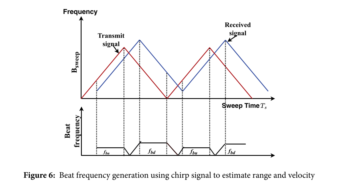 图中把"Transmit signal"与"Received signal"的扫频斜线画在同一坐标中,并把"Beat frequency"分段画出,标注了上坡 beat fbuf_{bu}fbu 与下坡 beat fbdf_{bd}fbd。从图形上看,beat frequency 就是"同一时刻发射与接收瞬时频率的差",而上下坡让这种差呈现不同的符号组合,从而对应式 (15)(16) 的加减结构。