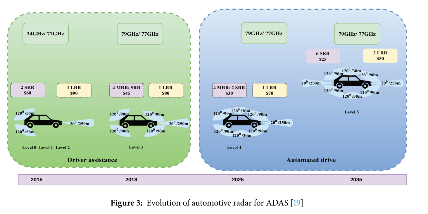 2015→2018→2025→2035 的演化可以总结为从"Driver assistance"走向"Automated drive",并标注不同阶段采用的频段组合(24/77/79 GHz),SRR/MRR/LRR 的数量变化与单价下降趋势(例如 LRR 从约 $90 逐步走向更低)。图中还用类似"120°/90 m""20°/250 m""120°/30 m"的标注表达不同雷达视场与量程。雷达越多、车流越密,互扰概率越高、目标越拥挤,要求更强的检测与角度分辨算法,反过来推动本文后续对 DOA、干扰抑制与跟踪的讨论。