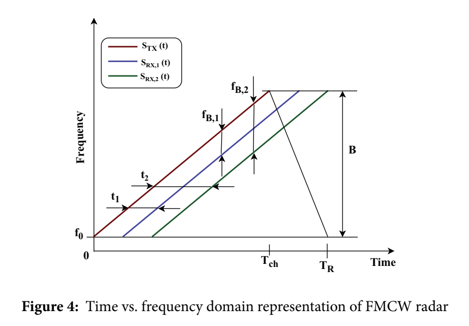 这幅时频图用一条红色斜线表示发射 chirp STX(t)S_{TX}(t)STX(t),两条不同延时的回波 SRX,1(t)S_{RX,1}(t)SRX,1(t)、SRX,2(t)S_{RX,2}(t)SRX,2(t) 用蓝/绿线表示。图中在两个时刻 t1,t2t_1,t_2t1,t2 画出发射与回波瞬时频率差,并标注 fB,1,fB,2f_{B,1},f_{B,2}fB,1,fB,2。我们可以直接从几何上读出:延时越大,发射线与回波线在同一时刻的频差越大,因此拍频越大,目标距离越远。图里还标出了扫频带宽 BBB、chirp 时长 TchT_{ch}Tch 和 chirp 重复周期 TRT_RTR,这些都是系统设计时决定分辨率与无模糊范围的关键参数。