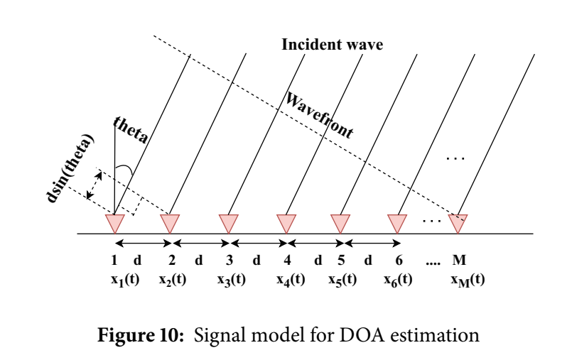 其中 σnv2\\sigma_{nv}\^2σnv2 由 CUT 周围的训练单元估计得到,TCFART_{CFAR}TCFAR 是与虚警概率相关的门限偏置。 #### Fig. 8:CA-CFAR 窗口结构与阈值生成  图中间红色块是 Cell Under Test(CUT),紧邻两侧蓝色块是 Guard cells(保护单元,用来防止目标泄漏污染噪声估计),更外侧绿色块是 Reference cells(训练单元)。训练单元经过求和/平均得到 ZCFARZ_{CFAR}ZCFAR,再乘以 KCFARK_{CFAR}KCFAR 得检测阈值,最后与 CUT 的平方律检测输出比较,产生检测结果。图里还画出"Square law detector""Comparator""Threshold of detection"等模块,使得 CA-CFAR 的实现结构非常直观。 作者随后给出 GOCA/SOCA/OS-CFAR 的阈值选取差异,并提供对比表。 **Table 4:CFAR 技术对比** | Type | Method of threshold detection | Advantages | Disadvantages | |-----------|-------------------------------------------------|------------------------------------------|----------------------------------------------| | CA-CFAR | Average power of neighboring cells as threshold | High SNR in uniform noise | Not beneficial for multiple target detection | | GOCA-CFAR | Two windows; take the larger mean as threshold | Good false alarm control in clutter | Not beneficial for multiple target detection | | SOCA-CFAR | Two windows; take the smaller mean as threshold | Beneficial for multiple target detection | Higher false alarm rate | | OS-CFAR | Sort training cells; pick one order statistic | Beneficial for multiple target detection | Longer computation duration | 注意 SOCA 的"更适合多目标"与"更高虚警率"是同一枚硬币的两面:它倾向于用较小均值作为噪声估计,从而降低阈值,提升检测灵敏度,但会增加误检风险。OS-CFAR 通过排序取分位数提升多目标鲁棒性,但排序代价更高。附录里会补上一个车载雷达里很常用但本文未写出的关键推导:在噪声服从指数分布(幅度平方为指数、功率为指数)的假设下,CA-CFAR 的 KCFARK_{CFAR}KCFAR 如何由期望虚警概率 PFAP_{FA}PFA 推导得到。 *** ** * ** *** ### 7. DOA(到达角)估计:从阵列几何到 Bartlett/MVDR/MUSIC/ESPRIT 的"数学骨架" #### Fig. 9:DOA 方法分类树  图把 DOA evaluation 分为 beamforming approaches(Bartlett、MVDR)、maximum likelihood estimator、subspace based approaches(MUSIC、ESPRIT)。本文重点展开 Bartlett/MVDR/MUSIC/ESPRIT,并在 Table 5 对比复杂度与分辨率。 #### Fig. 10:ULA 入射波前与阵元相位差示意  图中一列均匀线阵(标注 1d、2d、...、M)接收同一入射波前,阵元间距为 ddd,入射角为 θ\\thetaθ,几何路径差为 dsinθd\\sin\\thetadsinθ。这直接决定了相邻阵元接收信号的相位差 Δφ=2π(dsinθ)/λ\\Delta\\varphi = 2\\pi(d\\sin\\theta)/\\lambdaΔφ=2π(dsinθ)/λ,从而导向矢量呈指数序列。 #### 7.1 统一阵列模型与协方差:所有 DOA 算法共同的出发点 给出阵列接收模型: X(t)=A(θ)S(t)+N(t)(29) X (t) = A(\\theta) S (t) + N (t) \\tag{29} X(t)=A(θ)S(t)+N(t)(29) 其中 X(t)∈CM×1X(t)\\in\\mathbb C\^{M\\times 1}X(t)∈CM×1 是阵列观测,A(θ)∈CM×ktA(\\theta)\\in\\mathbb C\^{M\\times k_t}A(θ)∈CM×kt 是由各目标导向矢量组成的 steering matrix,S(t)∈Ckt×1S(t)\\in\\mathbb C\^{k_t\\times 1}S(t)∈Ckt×1 为源信号,N(t)N(t)N(t) 为噪声(方差 σ2\\sigma\^2σ2)。ULA 的导向矢量写为: a(θi)=\[1,e−j2πdsin(θi)/λ,...,e−j2πd(N−1)sin(θi)/λ\]T(30) a (θ_i)=\\left\[1, e\^{-j2\\pi d\\sin(\\theta_i)/\\lambda}, \\ldots, e\^{-j2\\pi d (N-1)\\sin(\\theta_i)/\\lambda}\\right\]\^T \\tag{30} a(θi)=\[1,e−j2πdsin(θi)/λ,...,e−j2πd(N−1)sin(θi)/λ\]T(30) 然后引入加权合成: Y(t)=wHX(t)(31) Y(t)=w\^H X(t) \\tag{31} Y(t)=wHX(t)(31) 输出功率: P(w)=E\[∣y(t)∣2\]=wHE\[XXH\]w=wHRcmw(32) P(w)=\\mathbb E\[\|y(t)\|\^2\]=w\^H\\mathbb E\[XX\^H\]w=w\^H R_{cm} w \\tag{32} P(w)=E\[∣y(t)∣2\]=wHE\[XXH\]w=wHRcmw(32) 这四条式子奠定了两类路线:波束形成类算法通过选权向量 www 直接塑形波束;子空间类算法通过分析 RcmR_{cm}Rcm 的特征结构(信号子空间与噪声子空间)实现超分辨 DOA。 #### 7.2 Bartlett:用 w=a(θ)w=a(\\theta)w=a(θ) 扫描功率谱 Bartlett(常规波束形成)取权向量 w=a(θ)w=a(\\theta)w=a(θ),空间功率谱: Pbart(θ)=aH(θ)Rcma(θ)aH(θ)a(θ)(33) P_{bart}(\\theta)= \\frac{a\^H(\\theta)R_{cm}a(\\theta)}{a\^H(\\theta)a(\\theta)} \\tag{33} Pbart(θ)=aH(θ)a(θ)aH(θ)Rcma(θ)(33) 它的主瓣宽度受阵列孔径限制,多目标近角分辨能力较弱,文章也明确写出其"多源低分辨率"的局限。 #### 7.3 MVDR:约束最小方差推到闭式解 MVDR(最小方差无失真响应)用约束优化刻画:在目标方向保持单位响应,同时让输出功率最小: minP(w)=wHRcmws.t.wHa(θ)=1(34) \\min P(w)=w\^H R_{cm} w \\quad \\text{s.t.}\\quad w\^H a(\\theta)=1 \\tag{34} minP(w)=wHRcmws.t.wHa(θ)=1(34) 其权向量闭式解: wMVDR=Rcm−1a(θ)aH(θ)Rcm−1a(θ)(35) w_{MVDR}=\\frac{R_{cm}\^{-1}a(\\theta)}{a\^H(\\theta)R_{cm}\^{-1}a(\\theta)} \\tag{35} wMVDR=aH(θ)Rcm−1a(θ)Rcm−1a(θ)(35) 对应功率谱: PMVDR(θ)=1aH(θ)Rcm−1a(θ)(36) P_{MVDR}(\\theta)=\\frac{1}{a\^H(\\theta)R_{cm}\^{-1}a(\\theta)} \\tag{36} PMVDR(θ)=aH(θ)Rcm−1a(θ)1(36) 这比 Bartlett 更能压制干扰,但对协方差估计误差敏感,且矩阵求逆带来高复杂度。附录会把从 (34) 到 (35) 的拉格朗日推导补充完整。 #### 7.4 MUSIC:噪声子空间正交性与伪谱峰 协方差模型: Rcm=A(θ)RsAH(θ)+σ2I(37) R_{cm}=A(\\theta)R_sA\^H(\\theta)+\\sigma\^2 I \\tag{37} Rcm=A(θ)RsAH(θ)+σ2I(37) 并进行特征分解: Rcm=UΛUH(38) R_{cm}=U\\Lambda U\^H \\tag{38} Rcm=UΛUH(38) 特征值排序: λ1≥⋯≥λKt\>λKt+1=⋯=λM=σ2(39) \\lambda_1 \\ge \\cdots \\ge \\lambda_{K_t} \> \\lambda_{K_t+1}=\\cdots=\\lambda_M=\\sigma\^2 \\tag{39} λ1≥⋯≥λKt\>λKt+1=⋯=λM=σ2(39) 定义信号子空间与噪声子空间: Us=\[u1,...,uKt\],Un=\[uKt+1,.