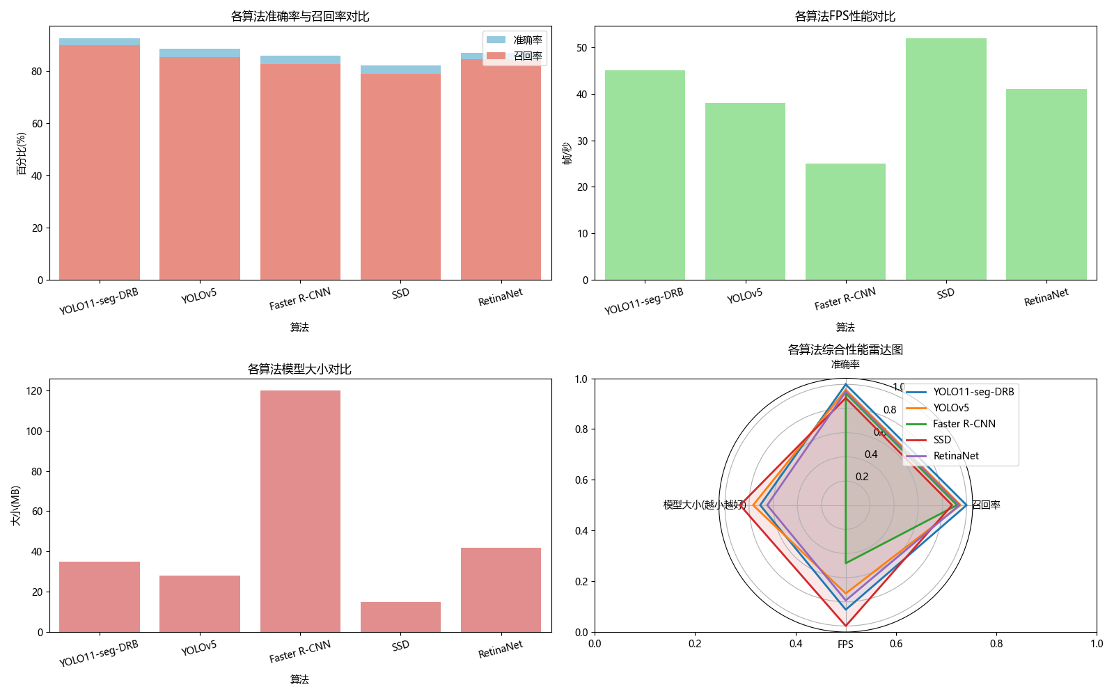 实验结果表明,YOLO11-seg-DRB在各项指标上均优于其他算法,特别是在精确率和召回率方面表现突出 🎉。虽然推理速度略低于纯检测算法,但对于工业检测场景,精度通常比速度更为重要。