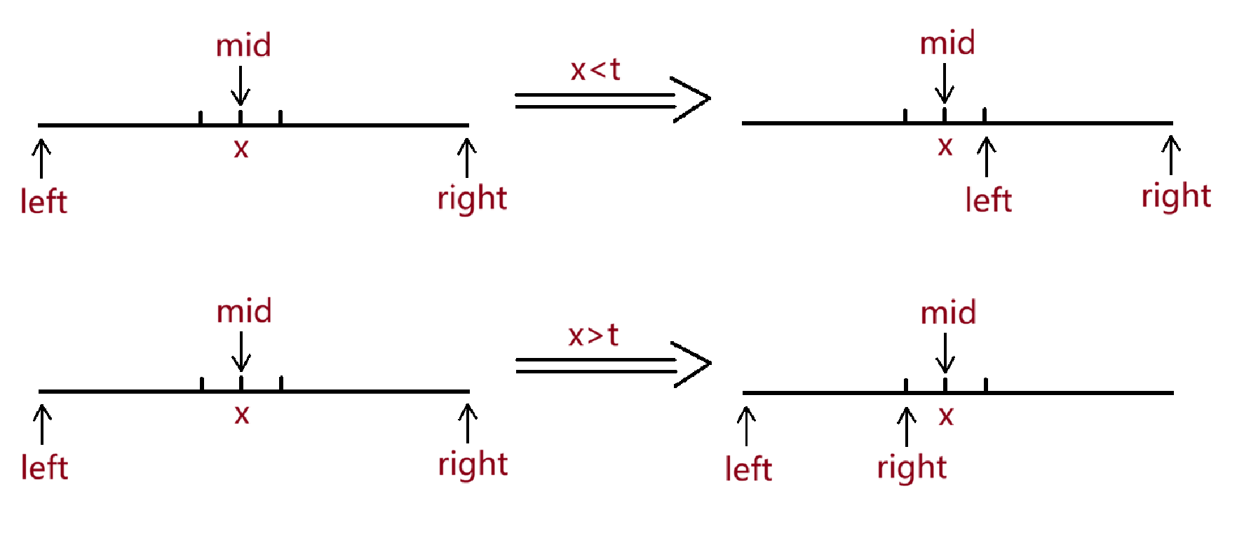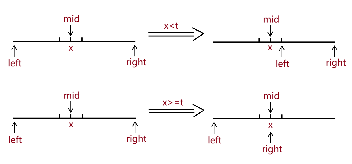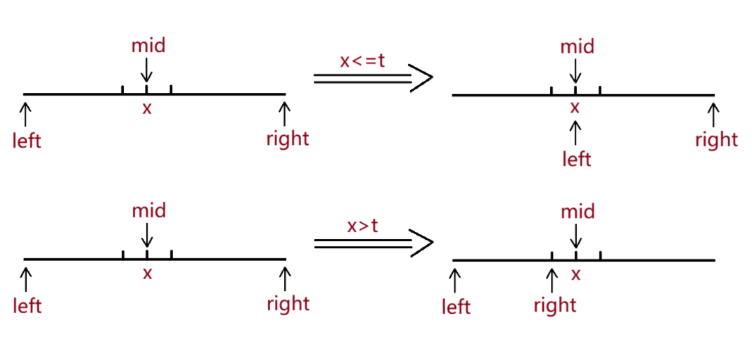 ,若x<=t,left==mid==right,退出循环。若x>t,left==mid==right,退出循环。符合要求。