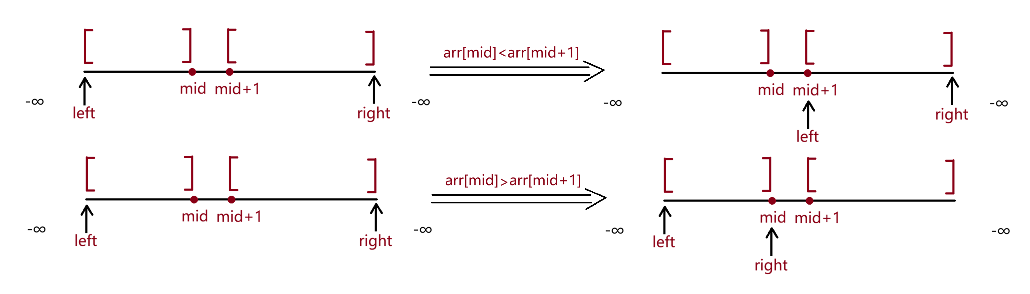 arr[mid]<arr[mid+1],那么左边的区间可能有峰值,右边的区间必定有峰值,到右边去找,left=mid+1