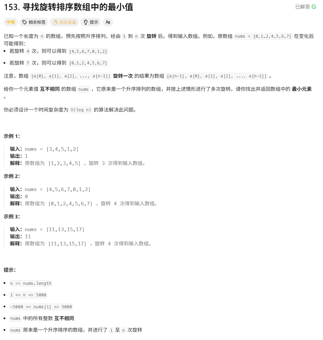 153. 寻找旋转排序数组中的最小值 - 力扣(LeetCode)