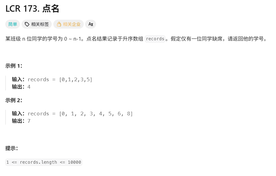 注意一个细节:如果数组是严格升序的(无空位),那么说明缺席同学在数组尾端后一个
