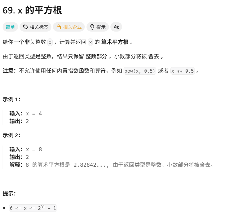也不难,只需要划分mid*mid<=x和>x的界限即可,若x==0,直接返回0