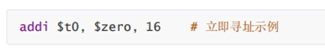 例如下图:把我们想要的立即数通过加zero寄存器里面的数据(固定是0),到我们指定的寄存器t0。不就相当于把16放到t0里面吗,从而实现把一个立即数放到相应的寄存器,这个过程我们发现被操作数16我们没有从某个地方去寻址得到的。