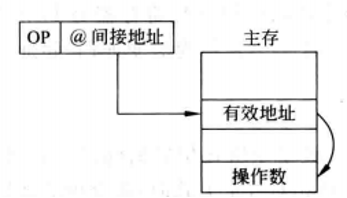 间接寻址:指令中给出的地址码是存放操作数有效地址的主存单元地址。图所示的是单级间接寻址过程,还可有多重间接寻址。EA=(A),加括号代表该地址里面存的数据。