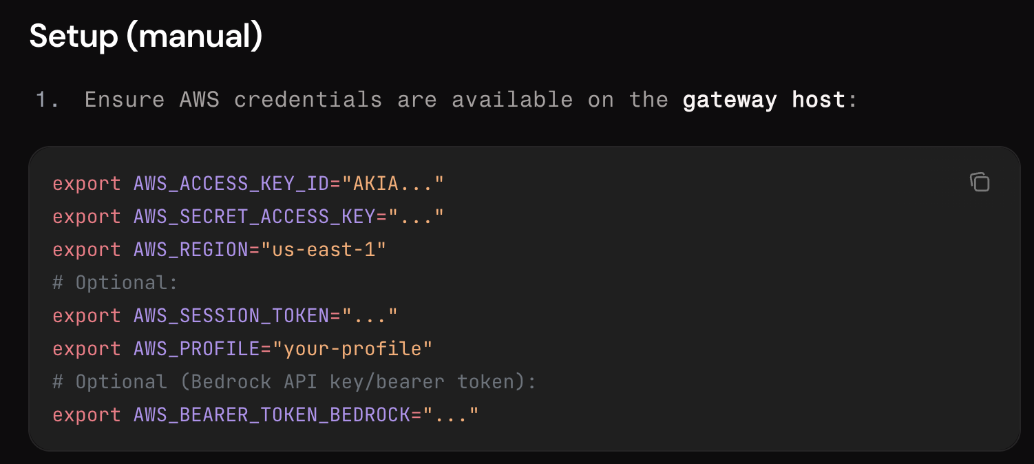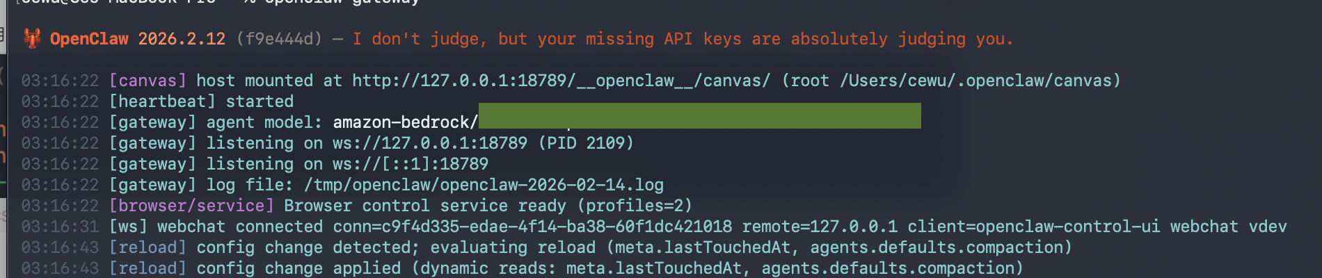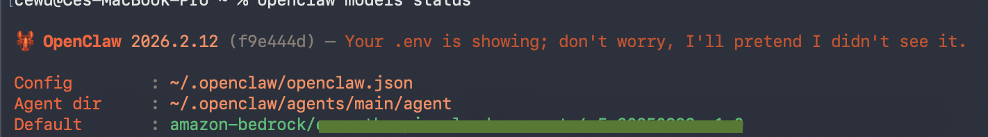首先在终端进行SSO登录,aws sso login --profile your_profile_name 会跳出一个浏览器页面,告知登录成功。这里就建立了一个SSO Session,在过期时间内是不需要重复登录的。但是根据重要的参考文档:https://docs.openclaw.ai/providers/bedrock