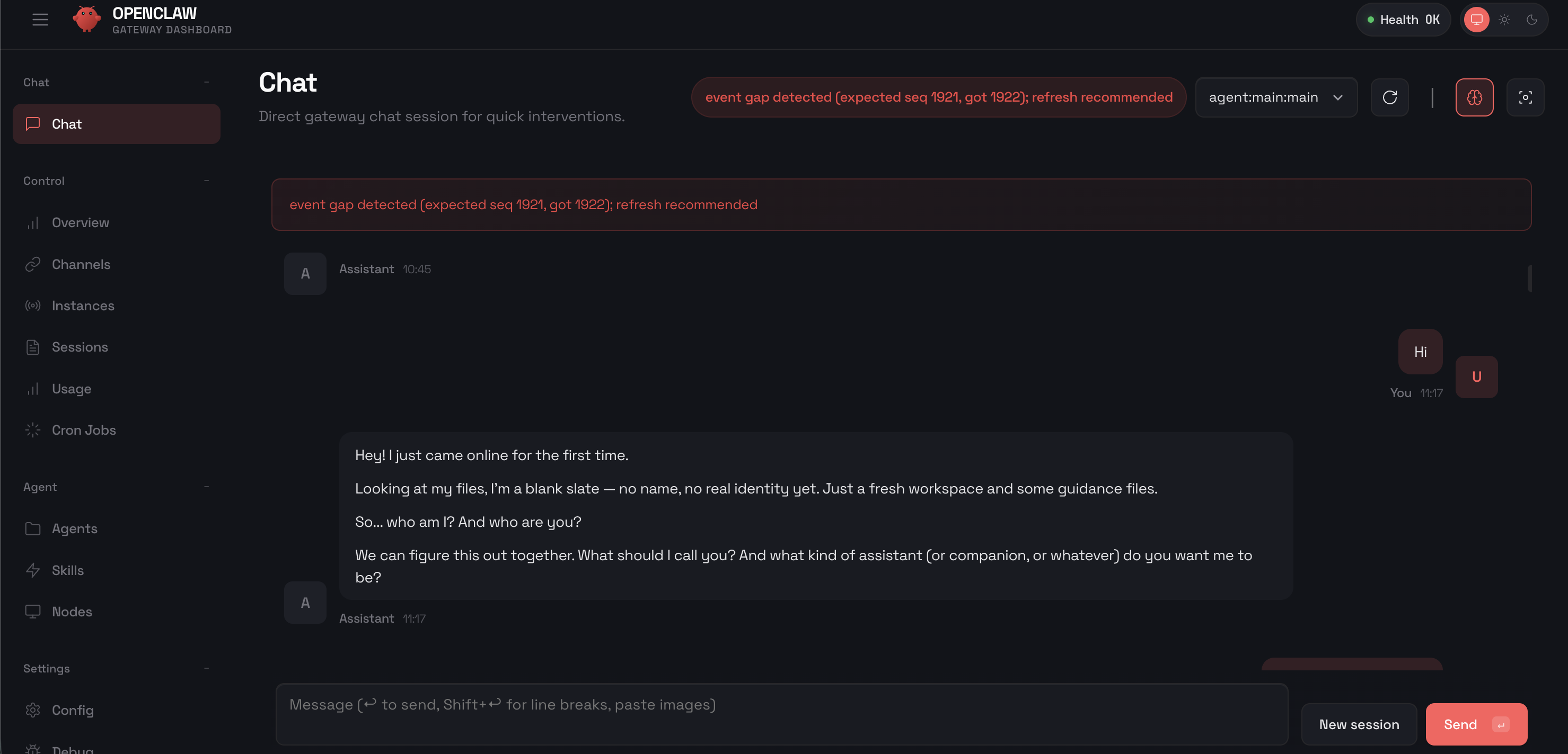 - Webchat,就是网页UI,像deepseek那种UI聊天页面,gateway启动的时候应该可以看到一个本地的端口,打开这个页面就是【下图】