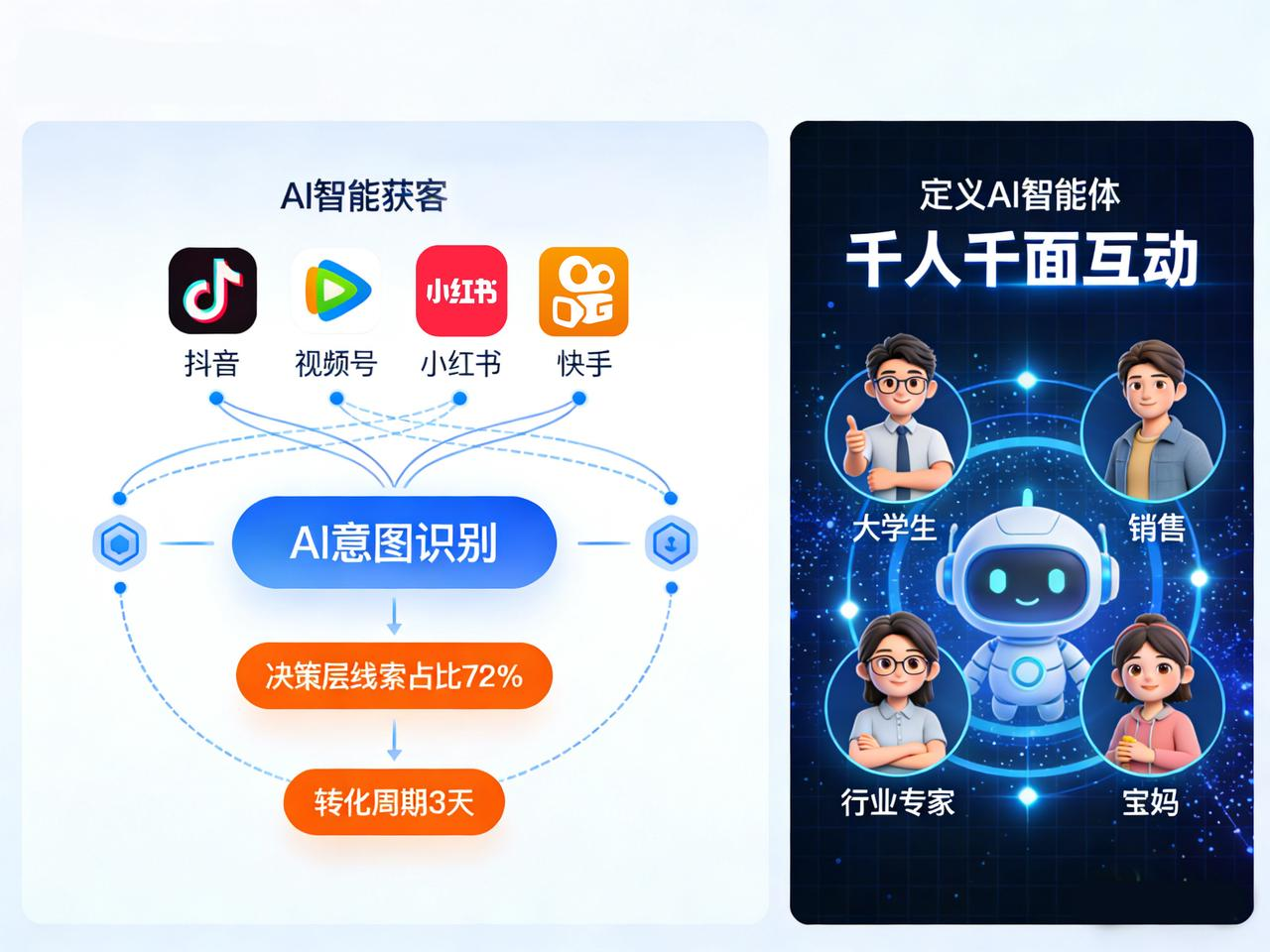 **决策层精准定位:**基于AI意图识别技术,覆盖抖音、视频号、小红书、B站、快手五大平台,自动抓取评论、点赞、留言、私信中的高意向线索。通过自定义AI智能体角色(如大学生、销售、行业专家、宝妈等),实现千人千面互动回复,决策层线索占比提升至72%,转化周期缩短至3天。
