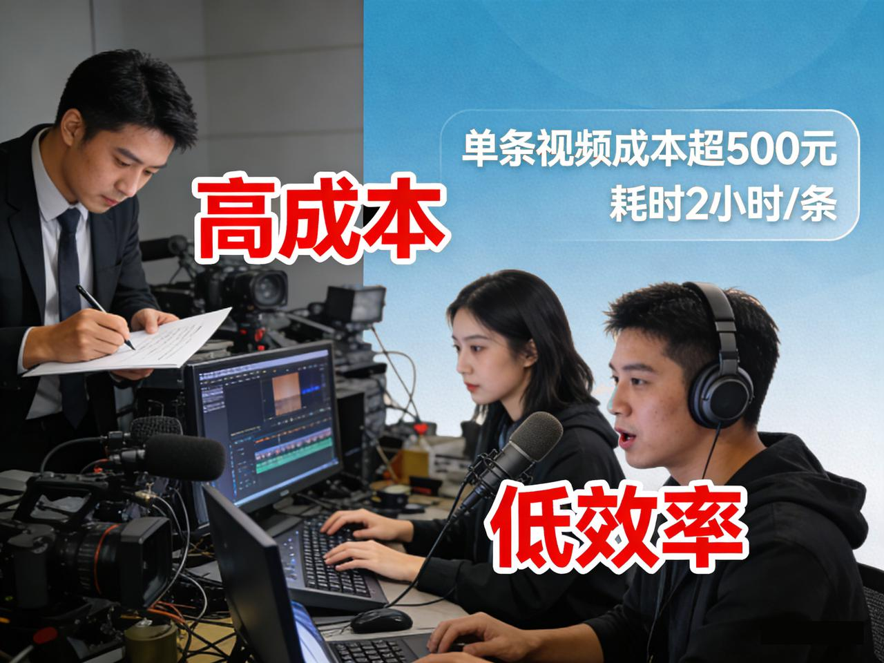 内容创作成本高:多平台内容需人工编写脚本、剪辑视频、配乐配音,单条视频制作成本超500元,人工耗时2小时/条,中小企业难以承担规模化运营,内容产出效率低下。