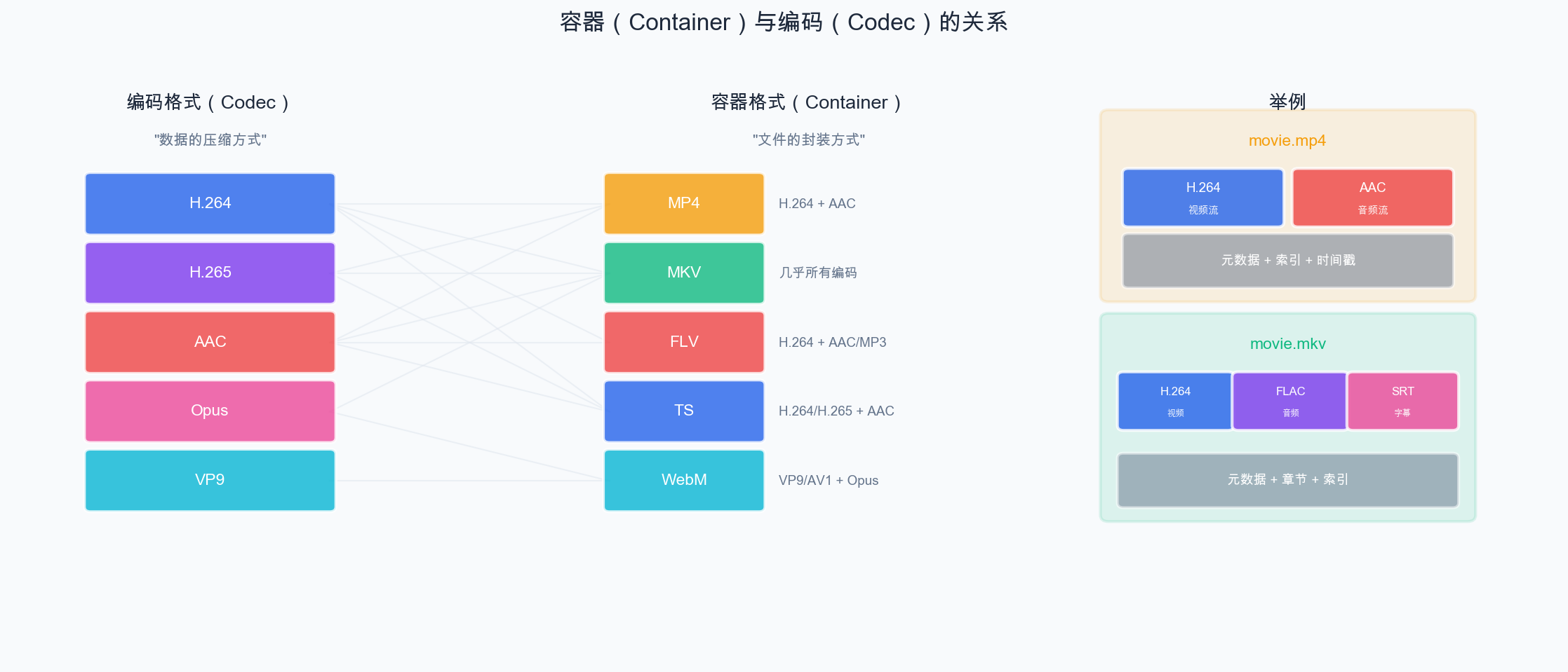 - 容器 vs 编码:容器是"包装盒",编码是"压缩方式",两者独立