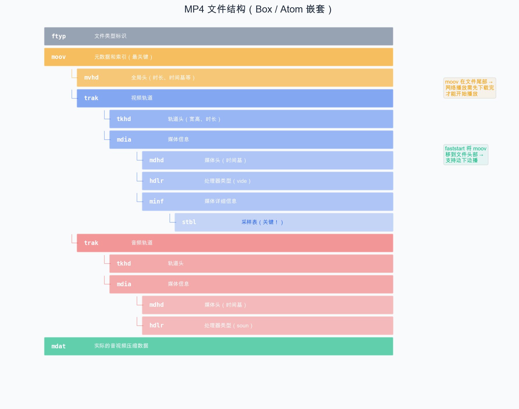 - 常见容器格式:MP4(通用)、MKV(功能丰富)、FLV(直播)、TS(广播)