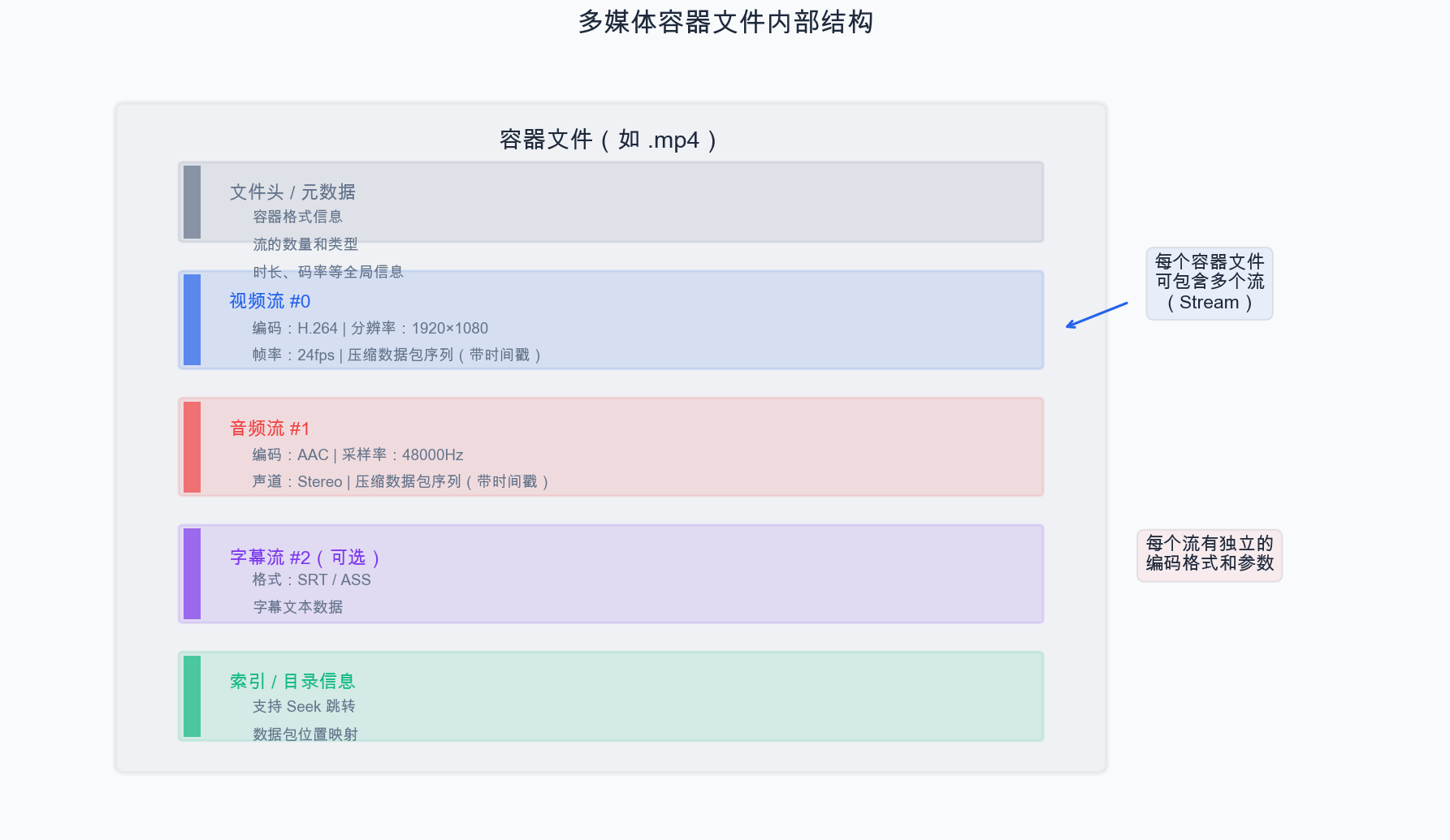 每个容器文件可以包含多个流(Stream),每个流有独立的编码格式和参数。