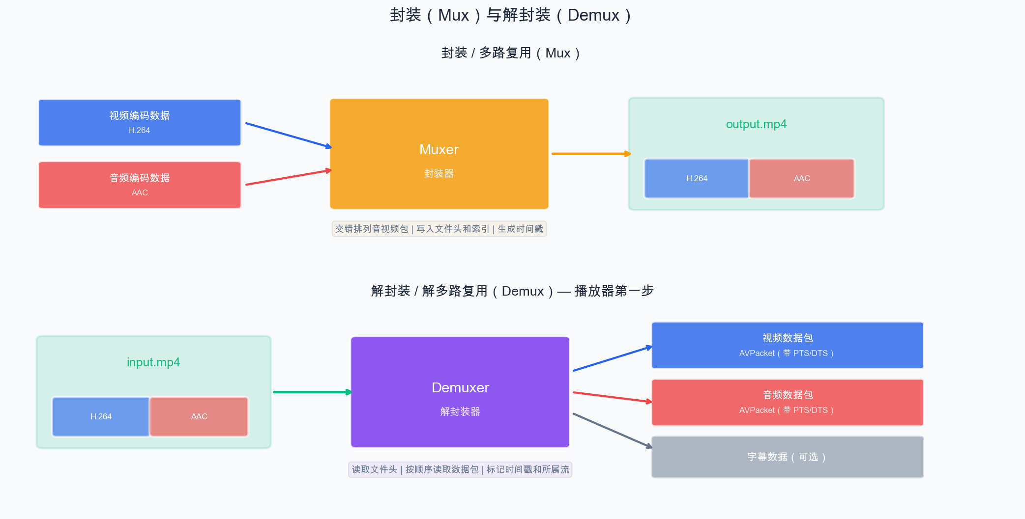 - Demuxer 负责:读取文件头获取流信息、按顺序读取数据包、标记时间戳和所属流